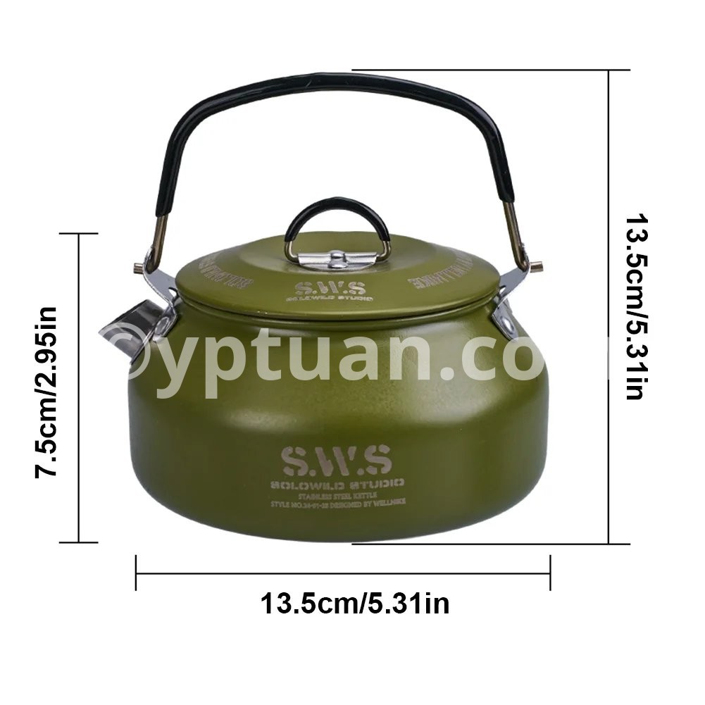 0.8L Outdoor Camping Kettle with Handle Portable Hiking Kettle Anti-Slip Ultralight Coffee Kettle for Outdoor Travel Camping Features: 1.Lightweight Durability:Crafted with a non-stick coating and robust stainless steel, our outdoor camping kettle offers a lightweight yet sturdy and safe option for outdoor enthusiasts, withstanding high temperatures and easy to clean after each use. 2.Rapid Boil Base:The bottom of the portable hiking kettle features a unique ring-shaped heat conduction design, ensuring quick and even heating that speeds up boiling time, while also providing a stable, non-slip base for safety. 3.Ergonomic Handle:Equipped with a silicone handle cover and a lockable design, the ultralight coffee kettle's handle stands on its own, preventing tipping and ensuring a comfortable, heat-resistant grip during use. 4.Drip-Filter Ready:Transform your water kettle tableware into a pour-over coffee maker with the additional drip-filter spout (sold separately), making it a versatile must-have for coffee lovers on the go. 5.Secure Lid Design:Our lightweight coffee pot's lid is ingeniously designed with a damping mechanism that prevents it from falling off while pouring, ensuring a spill-free experience and a secure brew every time. Specification: Origin: Mainland China Material: Food Grade 304 Stainless Steel Color: Black, Green, Natural (Silver) Size: 13.5cm/5.31in*7.5cm/2.95in Capacity: 800ml Net Weight: 200g Note: Due to the different monitor and light effect, the actual color of the item might be slightly different from the color showed on the pictures. Thank you! Please allow 1-2cm measuring deviation due to manual measurement.