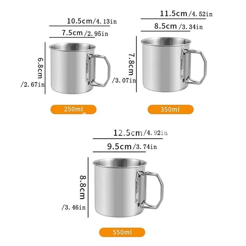 1Pc Stainless Steel Folding Handle Cup Portable Carabiner Cup Outdoor Camping Cups for Home Outdoor Camping Accessories Features: Lightweight and portable, durable, high hardness, wear-resistant, light weight, suitable for outdoor use. Not easy to burn, can be hung on the hollow independent beveled handle design, not easy to burn, can be hung on backpacks or branches The capacity is moderate to meet various outdoor eating needs. The small size, also called the hand, is perfect for serving rice, noodles and soups. Say goodbye to disposable tableware for outdoor use, which can be reused. The mouth of the bowl is comfortable and smooth to the touch, and it is not easy to hurt your hands. The bowl is rolled. Multiple bowls can be stacked and stored without taking up space. Specification: Material: stainless steel Size: 250ML: 2.95*2.67in/7.5*6.8cm, 350ML: 3.34*3.07in/8.5*7.8cm, 550ML: 3.74*3.46in/9.5*8.8cm Color: as pictured Package Includes: 1pc Notes: Please allow minor errors due to manual measurement. The colors may be a little difference for the different monitor display.