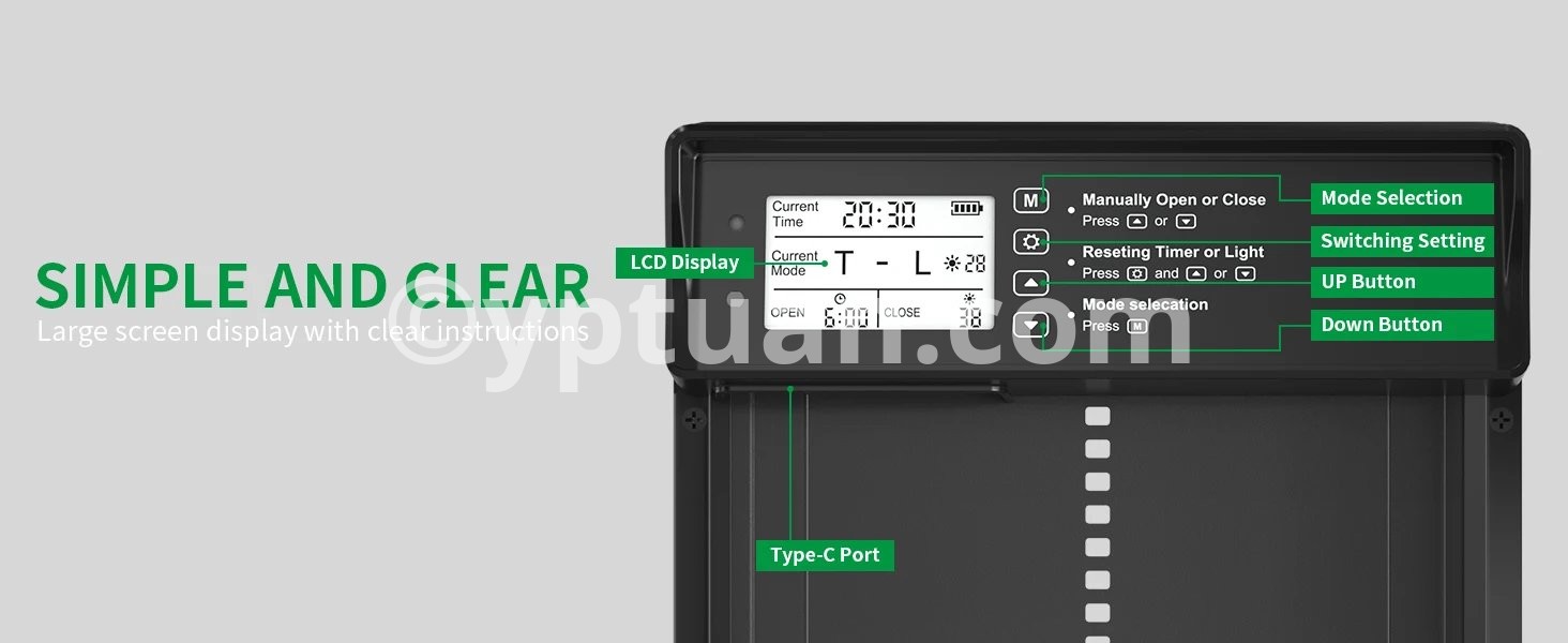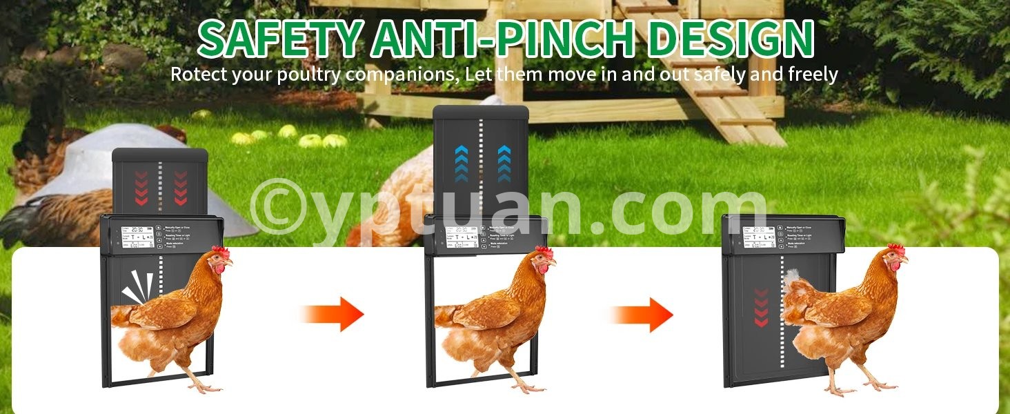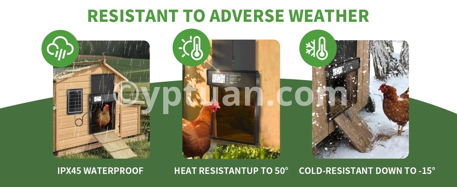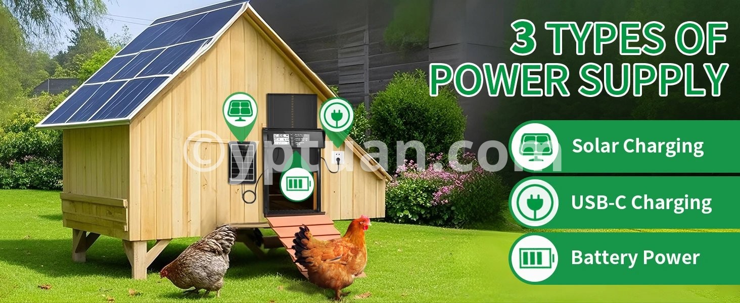 1.【Solar Powered & USB Charging】: Shikha automatic chicken coop door has a built-in 2000 mAh battery, a large solar panel and a type c cable, which can be powered by solar energy or charged using type c. Ensures continuous working in any weather. Solar power saves money and is eco-friendly. Battery-only power is prone to power off easily and requires frequent replacement. 2.【Remote & Manual Control】:The automatic chicken door supports up to 15 meters of remote control distance, as well as manual settings on the chicken door panel, providing great flexibility and convenience. Even on a cold day, you can control it remotely from your doorstep. And please note that when using the remote control for the first time, open the battery cover on the back to remove the power blocking tape inside. 3.【Anti-Pinch Function】:With the poultry's safety first in mind, we have designed the anti-pinch feature. If the door senses a poultry while closing, it will rise 3cm and stands still for 10s before closing again. Keep your poultries safe. 4.【Alert System】:Designed with alert system, if 3 abnormal door closings occur, a continuous red light and beep alarm will sound until the door is properly closed. Moreover, if a predator forces the closed door open, a flashing red light and alarm will activate to scare off the predator or notify you of a abnormal situation in your coop. 5.【Large LED Screen】:Equipped with a large LED screen to ensure optimal visibility, it allows you to easily and accurately view the working status of the auto chicken coop door, including battery level, time, and light sensor value, giving you a more satisfactory user experience. 6.【Durable Aluminum Alloy Construction】: Our solar chicken coop door is made of high quality aluminum alloy and ABS to ensure durability, water resistance, and corrosion resistance to withstand all kinds of harsh weather and environments.