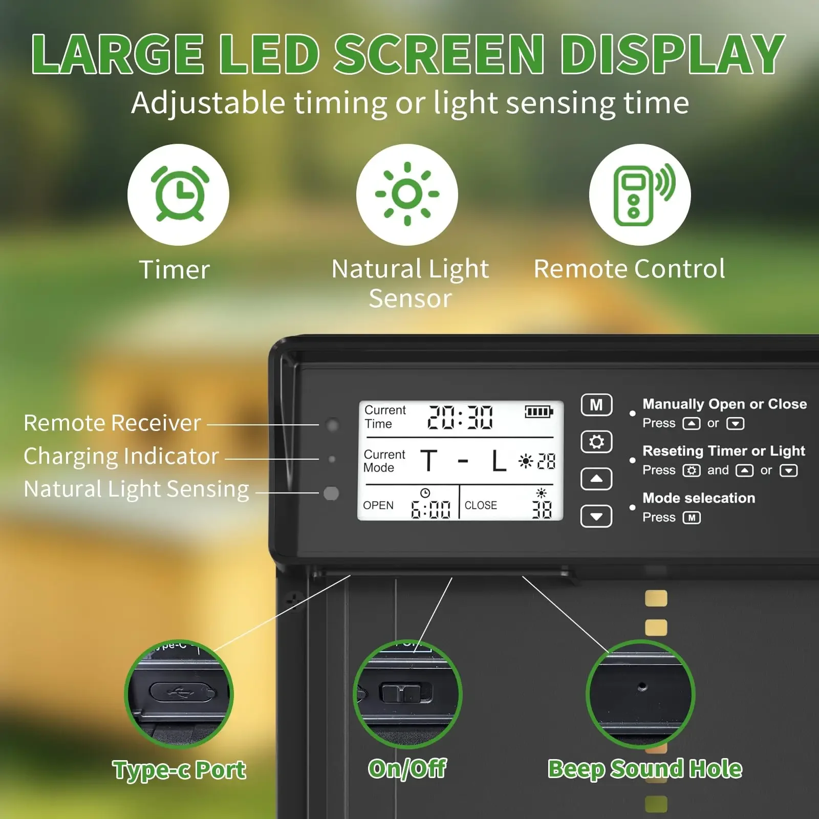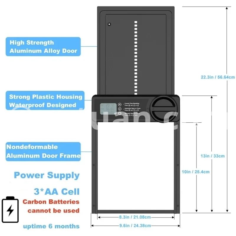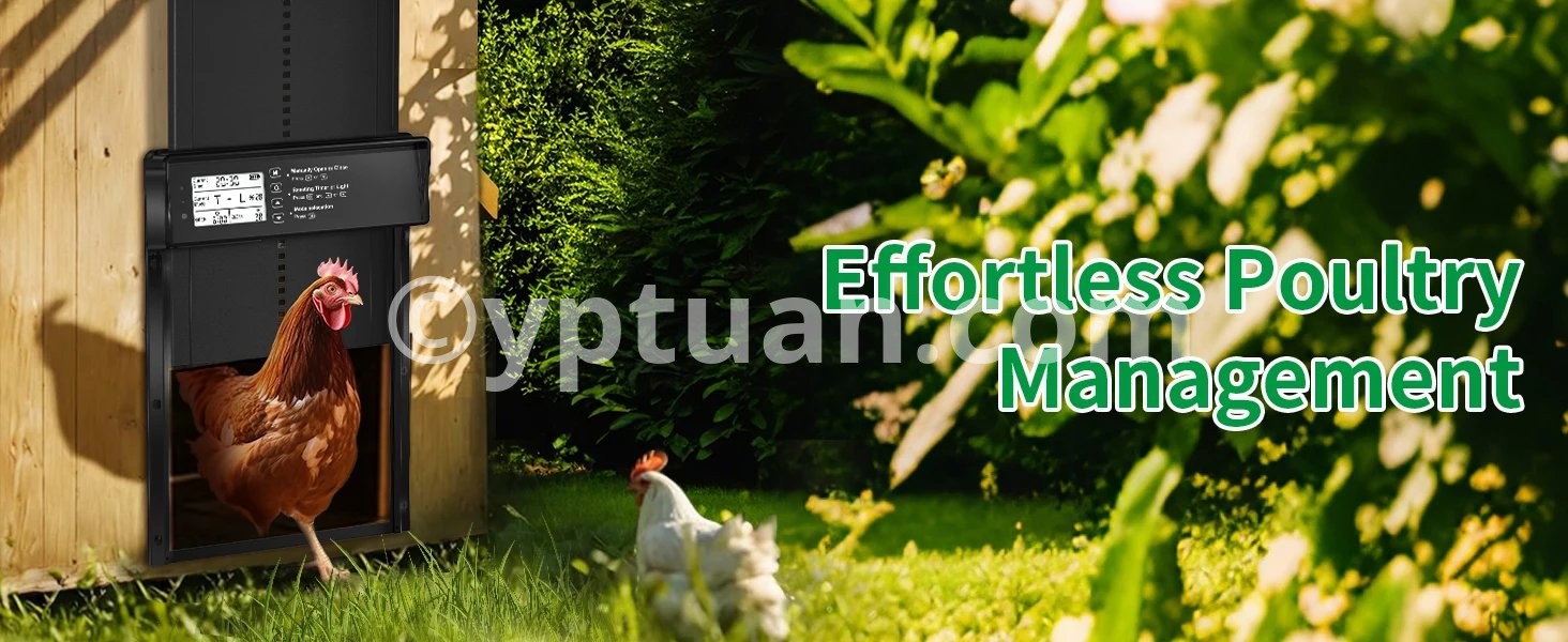 1.【Solar Powered & USB Charging】: Shikha automatic chicken coop door has a built-in 2000 mAh battery, a large solar panel and a type c cable, which can be powered by solar energy or charged using type c. Ensures continuous working in any weather. Solar power saves money and is eco-friendly. Battery-only power is prone to power off easily and requires frequent replacement. 2.【Remote & Manual Control】:The automatic chicken door supports up to 15 meters of remote control distance, as well as manual settings on the chicken door panel, providing great flexibility and convenience. Even on a cold day, you can control it remotely from your doorstep. And please note that when using the remote control for the first time, open the battery cover on the back to remove the power blocking tape inside. 3.【Anti-Pinch Function】:With the poultry's safety first in mind, we have designed the anti-pinch feature. If the door senses a poultry while closing, it will rise 3cm and stands still for 10s before closing again. Keep your poultries safe. 4.【Alert System】:Designed with alert system, if 3 abnormal door closings occur, a continuous red light and beep alarm will sound until the door is properly closed. Moreover, if a predator forces the closed door open, a flashing red light and alarm will activate to scare off the predator or notify you of a abnormal situation in your coop. 5.【Large LED Screen】:Equipped with a large LED screen to ensure optimal visibility, it allows you to easily and accurately view the working status of the auto chicken coop door, including battery level, time, and light sensor value, giving you a more satisfactory user experience. 6.【Durable Aluminum Alloy Construction】: Our solar chicken coop door is made of high quality aluminum alloy and ABS to ensure durability, water resistance, and corrosion resistance to withstand all kinds of harsh weather and environments.