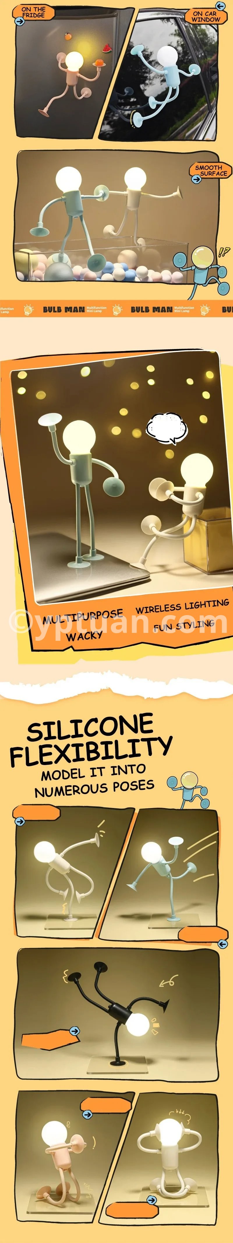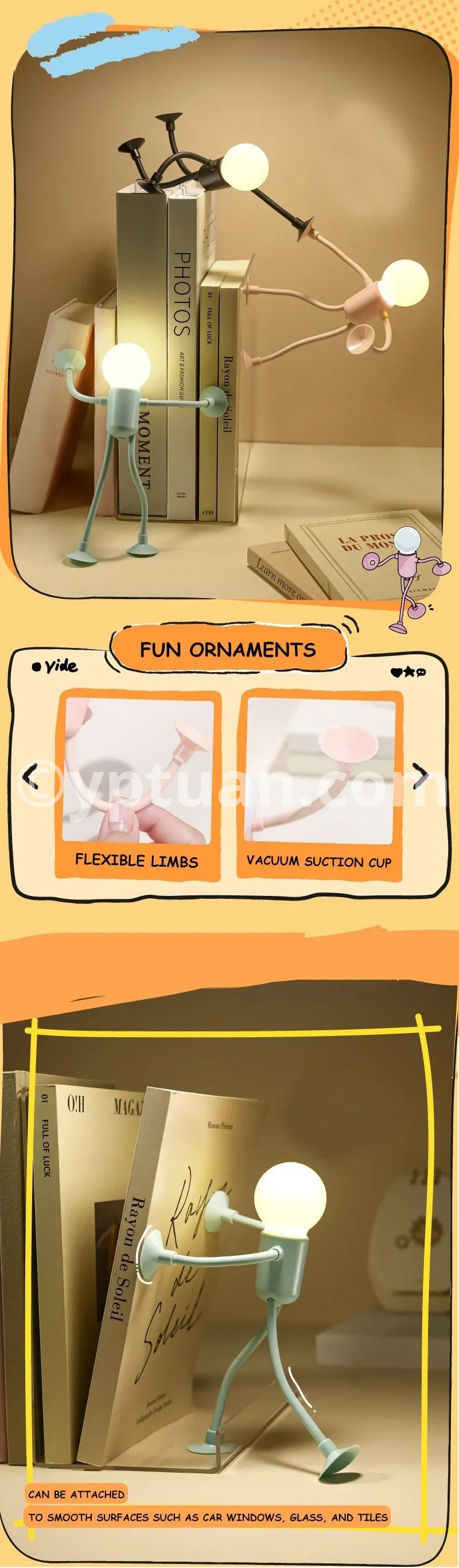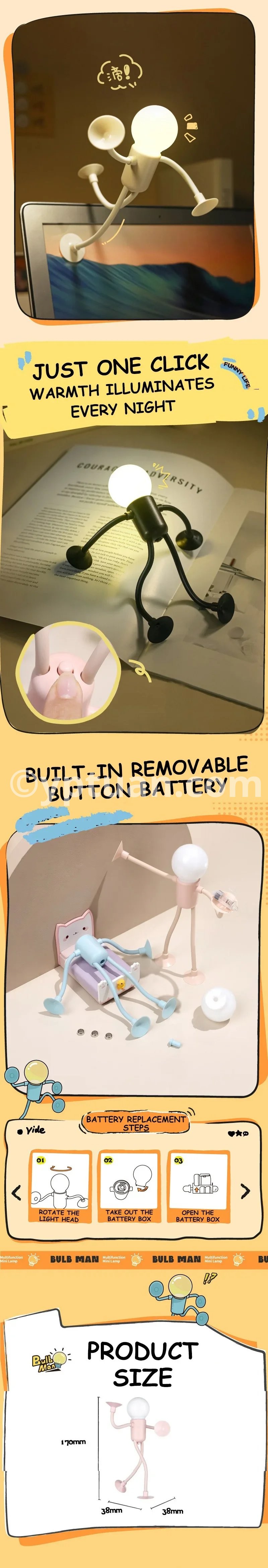 ❤❤Warm reminder: 1.Due to different computer resolutions, the color may be slightly distorted. 2.Due to manual measurement, please allow a measurement deviation of 1-2 cm. ★Features: 【Interesting and fun design】 The new cute light bulb has flexible limbs that can be bent and shaped in countless ways, bringing infinite creativity and fun! This mini night light can be inverted, placed, or hung to illuminate any space 【Vacuum suction cup】 equipped with a vacuum suction cup, this night light is easy to fix on smooth surfaces such as refrigerators, car windows, glass, and tiles 【Reliable and bright lighting】 Simply press lightly to turn on the light. This night light is designed with advanced technology, and as the room darkens, the light becomes brighter, making it particularly suitable for the elderly and children 【Creative Decorative Lights】 These cute lights are perfect as bedroom decorative lights, in addition to tables, offices, bookshelves, adding a touch of fantasy to any room 【Ideal gift choice】 Use this sports night light to enhance the atmosphere of your living space and create a relaxed and comfortable environment. This is a thoughtful and practical gift for family and friends ★Description: Battery type: Three button battery Dimming level: First level Product size: 38 * 38 * 170mm Rated power: 0.585W Material: ABS+silicone metal hose Rated current: 0.13A