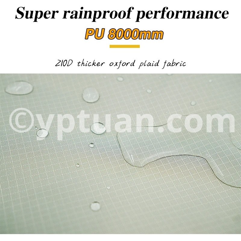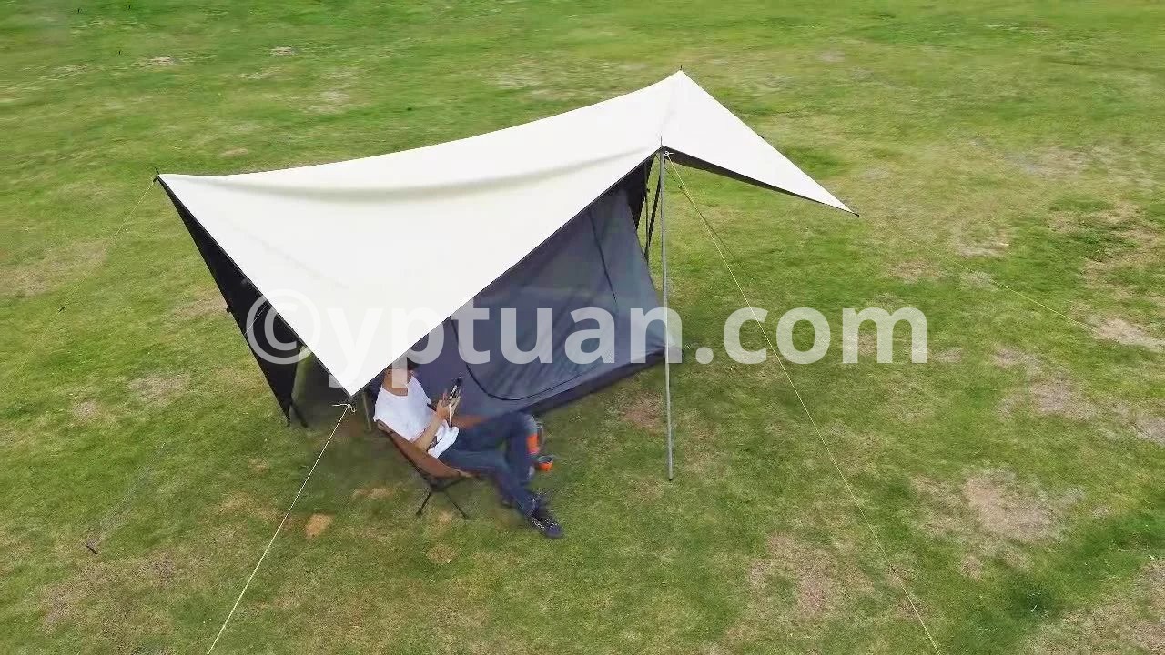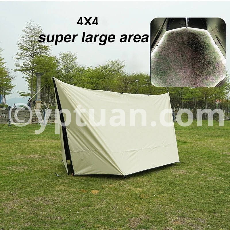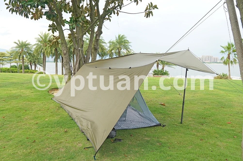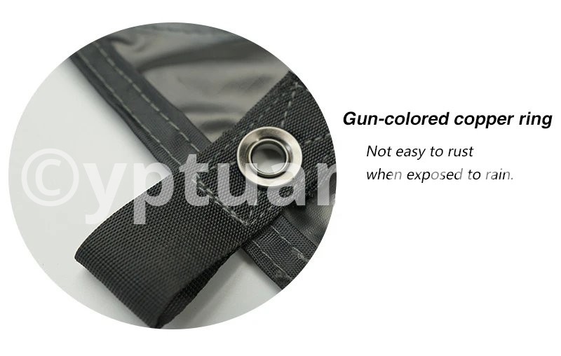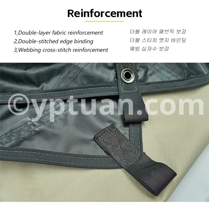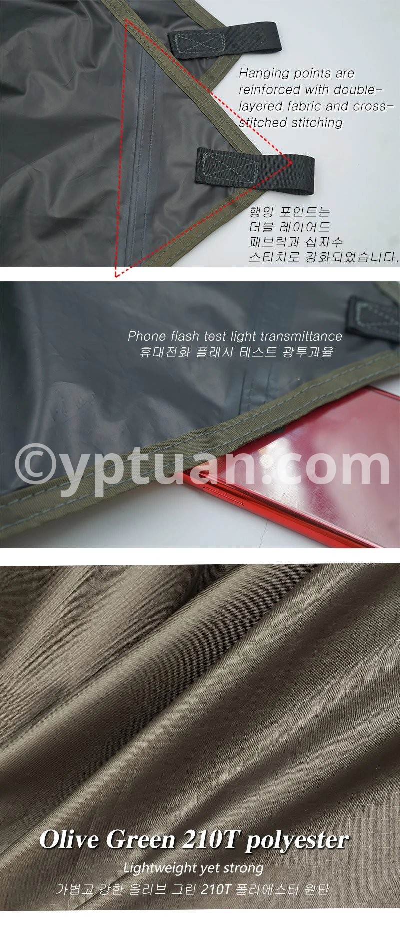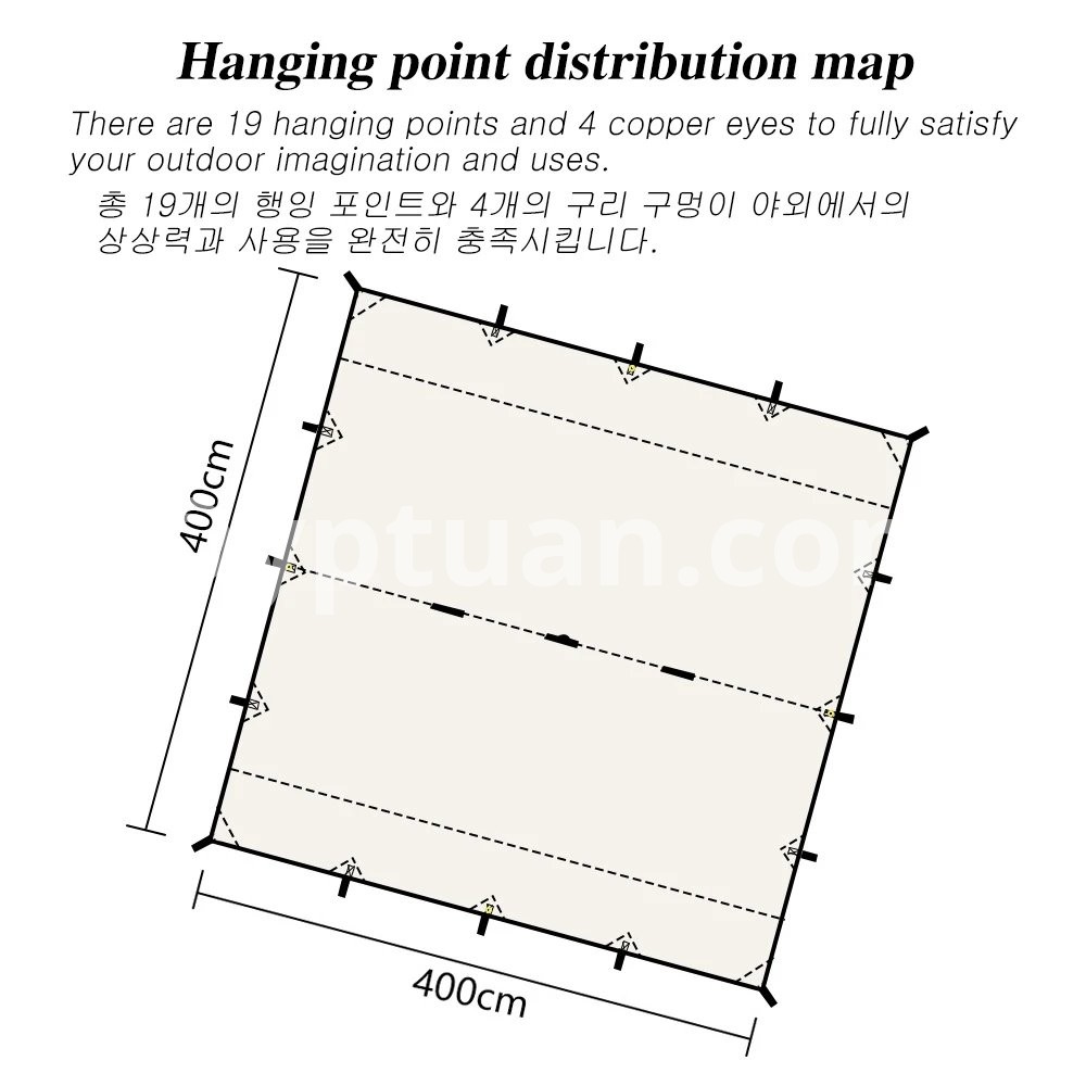 Item: 19 hang points tarp for camping Size: 4 meters width, 4 meters length Colour: off white / olive green / black Material: Coating: black coating on back Waterproof index: PU8000mm Light transmittance: 0.01% There are 19 hanging points and 4 copper rings on the tarp. As shown below: