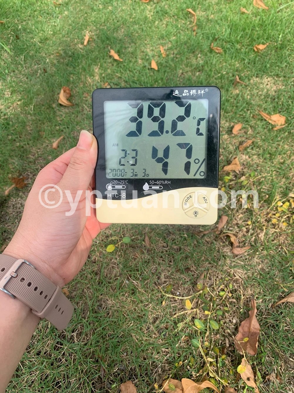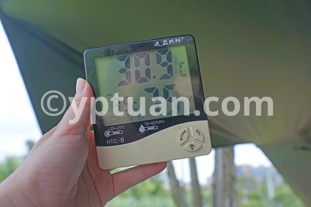 Outside the tarp, the thermometer read 39.2°C, while inside our black coated tarp it was only 30.9°C, a large difference of 8.3°C! It can be seen how important a black coated awning is for outdoor camping in summer!