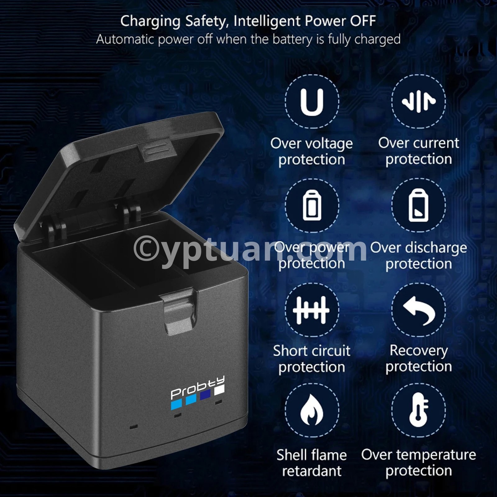 Features of Battery: 1.Premium Lithium ion cells New Rechargeable Battery Pack 2.High Energy Density, Extra Long Life, Memory Free 3. Extra Power, More Shots for Your Cameras 4. Safe and reliable, perfect for using on travelling and outdoor activities. Battery Description: For Gopro Hero 13 Battery Capacity :2280mAh/8.9Wh Type :Rechargeable Li-ion battery Package:Yes Large 2280mAh capastat y,grater than original battery capacity Up to 115 min of shooting time on a single battery(Use time is different in different modes). 100% perfect fit for Gopro Hero 13 , No pop-ups. Battery Charger Input: 5V/3A Output: 4.5V/0.8A*3 Dimension: 54mm x 51mm x 57mm Package:Yes Package includes:As you choose