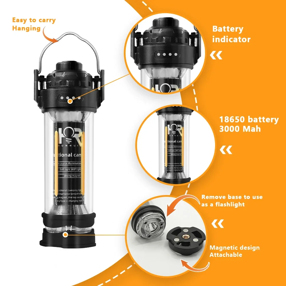 Specification: Material: PC + abs, resin (lampshade) Color: army green, black, khaki (optional) Weight: 150g Battery: 3000 mA 18650 lithium battery Charging: 1.5-2H Brightness: 35LM-85LM Dimming: Capable of stepless dimming Color temperature: 3100K Waterproof: IPX6