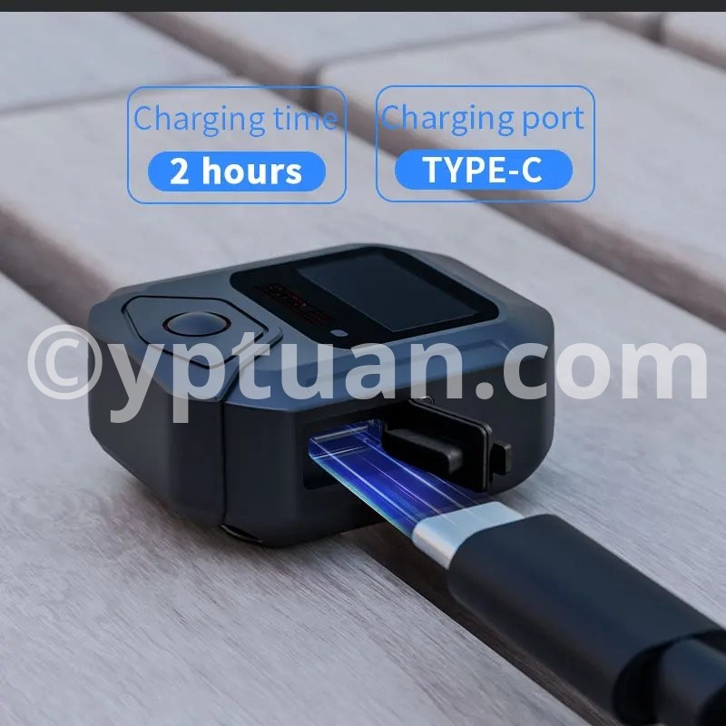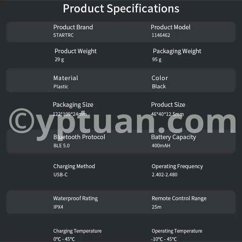 Name: GPS Bluetooth Remote Controller Size: 46*40*12.5mm Net weight: 29g Color: Black Material: Plastic Bluetooth Protocol: BLE 5.0 Battery Capacity: 400mAh Charging Method: USB-C Operating Frequency: 2.402-2.480 Waterproof Rating: IPX4 Remote Control range: 25m Charging Temperature: 0 to 45 Degree Operating Temperature: -10 to 45 Degree Package List: Bluetooth remote control * 1, wrist strap * 1, bicycle strap * 1, charging cable * 1, instruction manual * 1