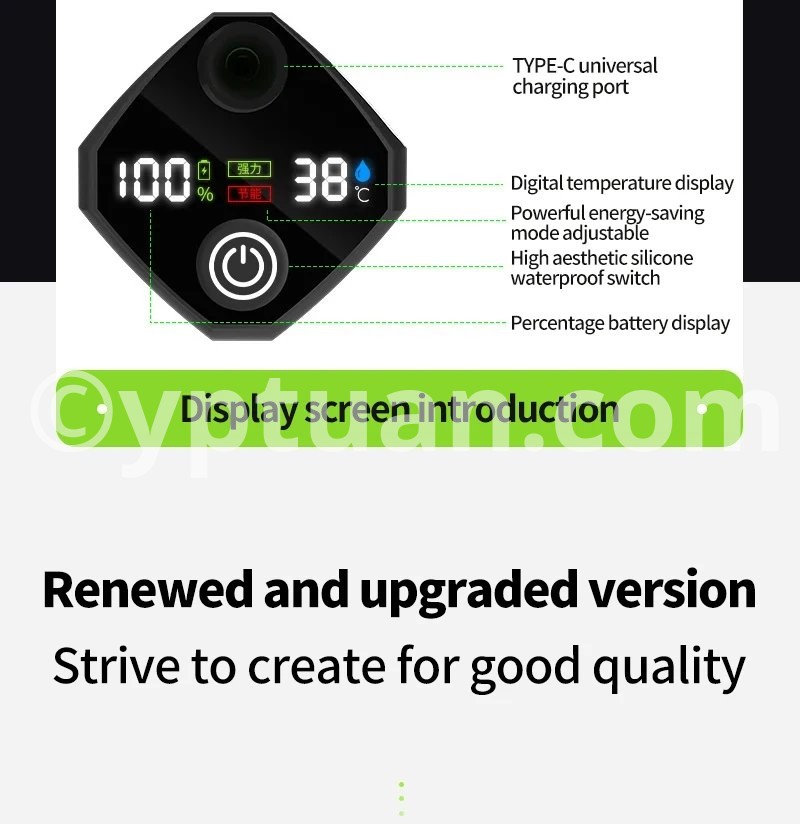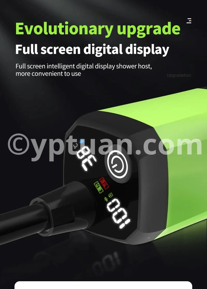 Full Screen Intelligent Digital Display: Easily monitor the temperature and battery level. Adjustable High-Efficiency Energy-Saving Mode: Customize your shower experience to suit your needs. 6000mAh Battery: Charges in just 1-2 hours for long-lasting use. Portable and Versatile: Perfect for camping, RVs, and outdoor adventures. High-Quality Materials: Made with eco-friendly PVC and silicone for durability and safety.