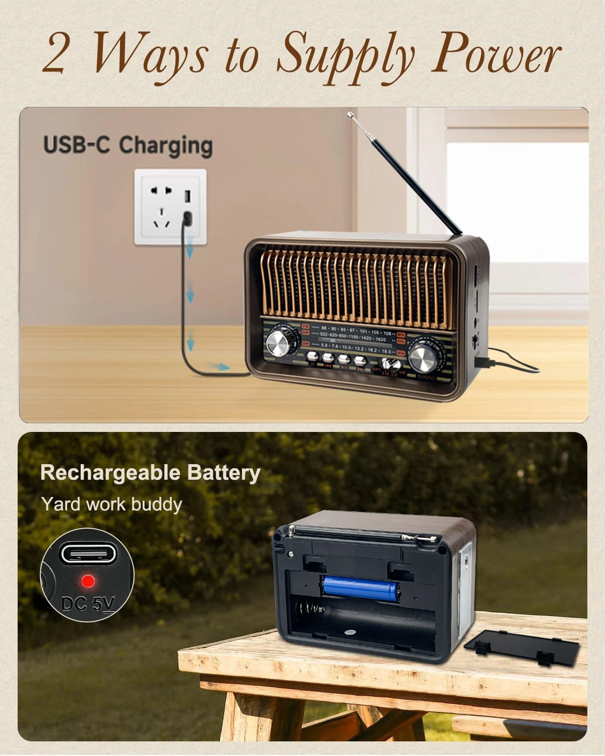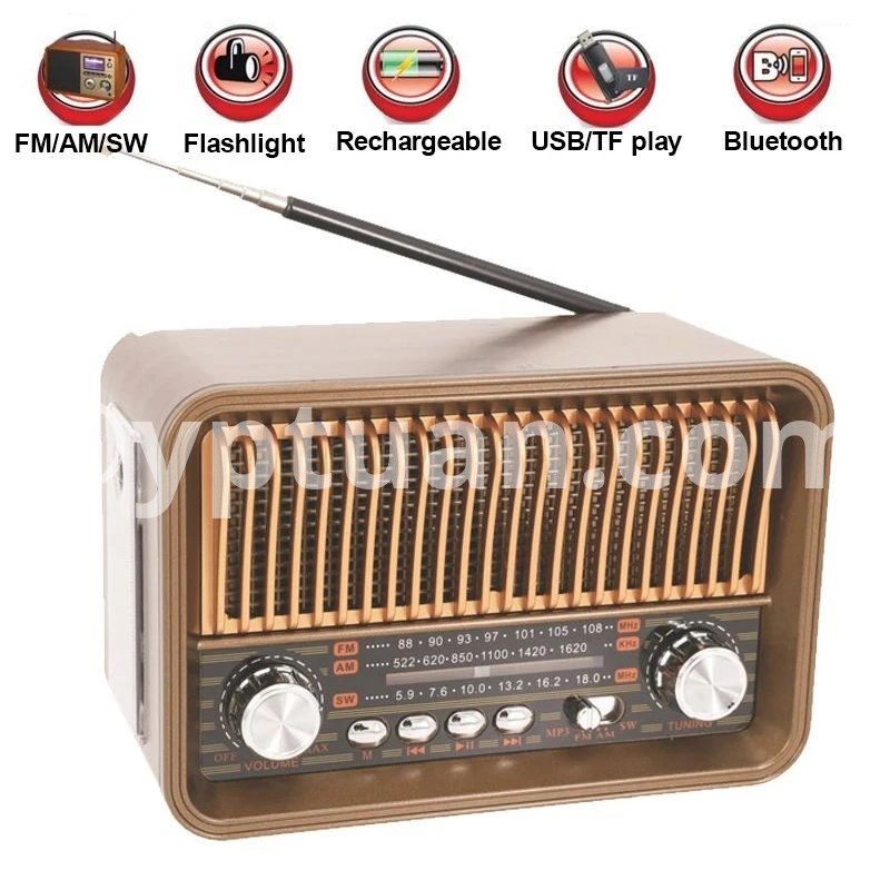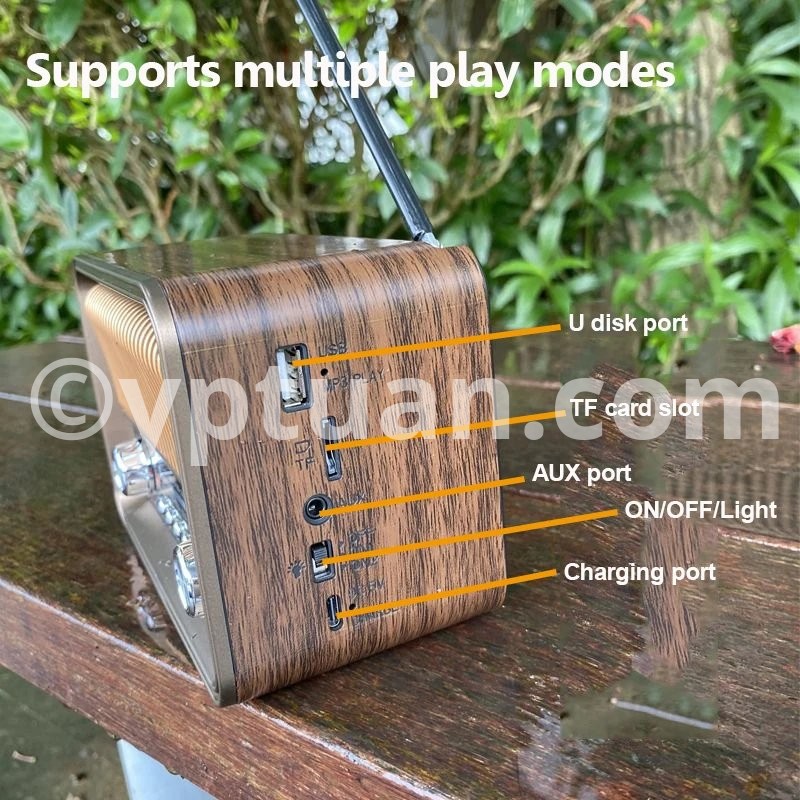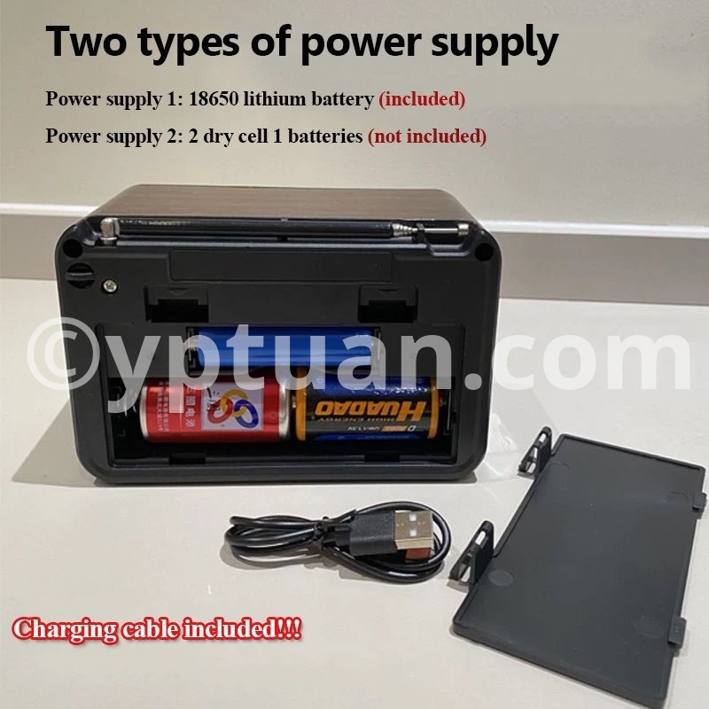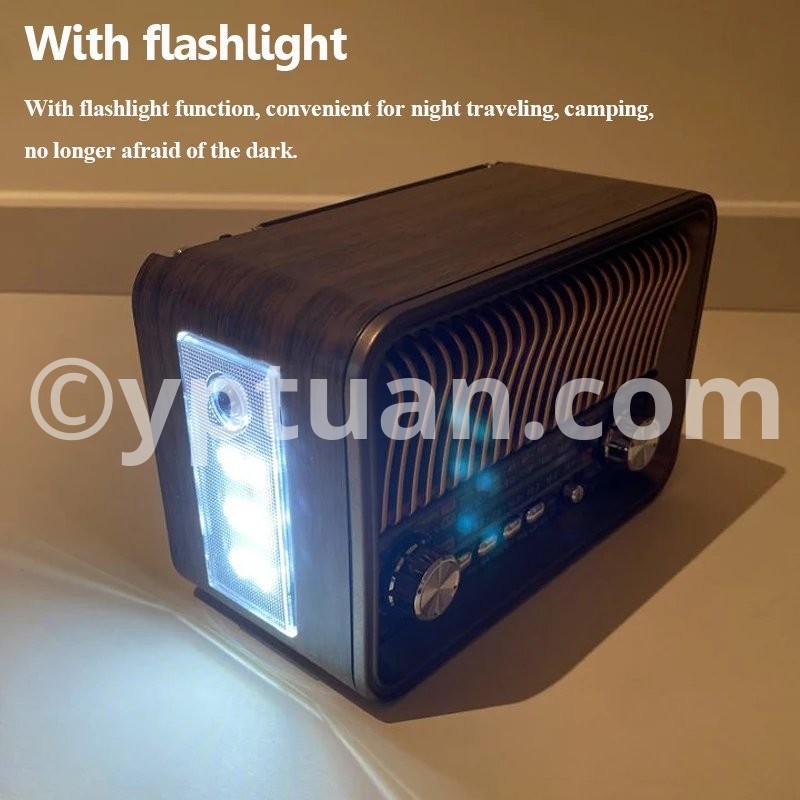 1.FM/AM/SW 3-band radio, with rechargeable battery/with handheld/AUX jack/with flashlight illumination 2.With rechargeable battery/with handheld/AUX jack/with flashlight illumination 3.Support TF card/U disk playback and Bluetooth connection. 4.With DC 5V charging jack (equipped with charging cable) 5.DC 3V(UM-1X2) dry battery not included. 6.FM:88-108MHZ 7.AM:522-1620KHZ 8.SW:5.9-18MHZ 9.Weight 510g