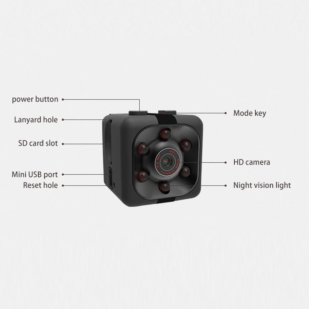 Mini Wireless Security Camera Full HD 1080P Night Vision Portable Camcorder Video Record Motion Detection for Home Outdoor Feature: 1. Full HD 1080P: This mini high-definition video camera offers two video resolutions: 1920 x 1080P and 1280 x 720P. Enjoy crisp and clear footage of your outdoor activities and adventures. 2. Motion Detection Mode: The motion detection feature allows you to use this mini camera for recording when motion is detected. It ensures that you don't miss any important moments, making it ideal for security purposes as well. 3. Built-in 200mAh Battery: The security camera comes with a built-in 200mAh battery that provides up to 60 minutes of continuous recording (in 1080P resolution) on a full charge. It also supports video recording while charging. The camera supports up to 32GB TF card storage (TF card not included in the package). 4. Night Vision with 6 Infrared LEDs: Equipped with 6 infrared LEDs, this small camera enables night vision functionality without any visible illumination. It has a visual range of 10 to 15 feet, allowing you to capture clear footage even in low-light conditions. 5. 140° Wide-Angle Lens: The super compact and discreet design of this mini camera allows for 360° rotation and can be easily mounted. With its 140° wide-angle lens, you can capture a larger field of view, ensuring that nothing goes unnoticed.Specification: Model: SQ11 Color: Black Video format: AVI Video encoding: M-JPEG Video resolution: 1920x1080P 1280x720P Video frame rate: 30fps Image Scale: 4:3 Camera resolution: 12M (4032x3024) Image format: JPG Mobile detection: supported TV OUT: Supported Battery type: built-in high capacity polymer lithium battery Battery capacity: 200mah Working hours: sustainable shooting for up to 100 minutes Charging voltage: DC-5V Storage support: capable of supporting 32G TF card Transmission speed: high-speed USB2.0 Interface type: 8pin USB Support system: Windows me/2000/XP/2003/Vista: OS: Linux Playback software: system built-in or mainstream video playback software Product size: 22 * 22 * 22mm/0.87 * 0.87 * 0.87in Color box size: 94 * 92 * 30mm/3.7 * 3.62 * 1.18in Gross weight: 60g Note: Due to the different monitor and light effect, the actual color of the item might be slightly different from the color showed on the pictures. Thank you! Please allow 1-2cm measuring deviation due to manual measurement.