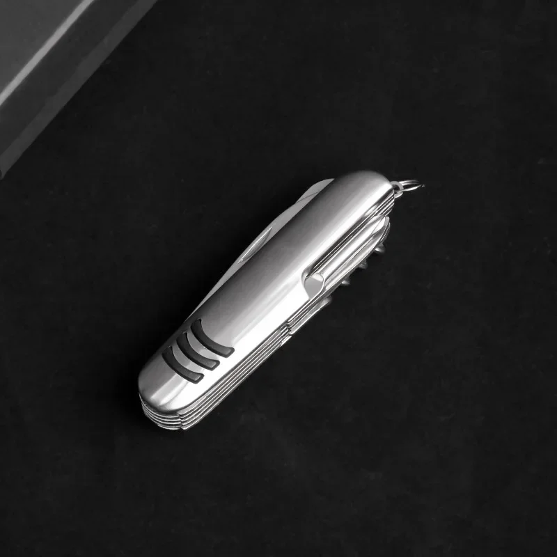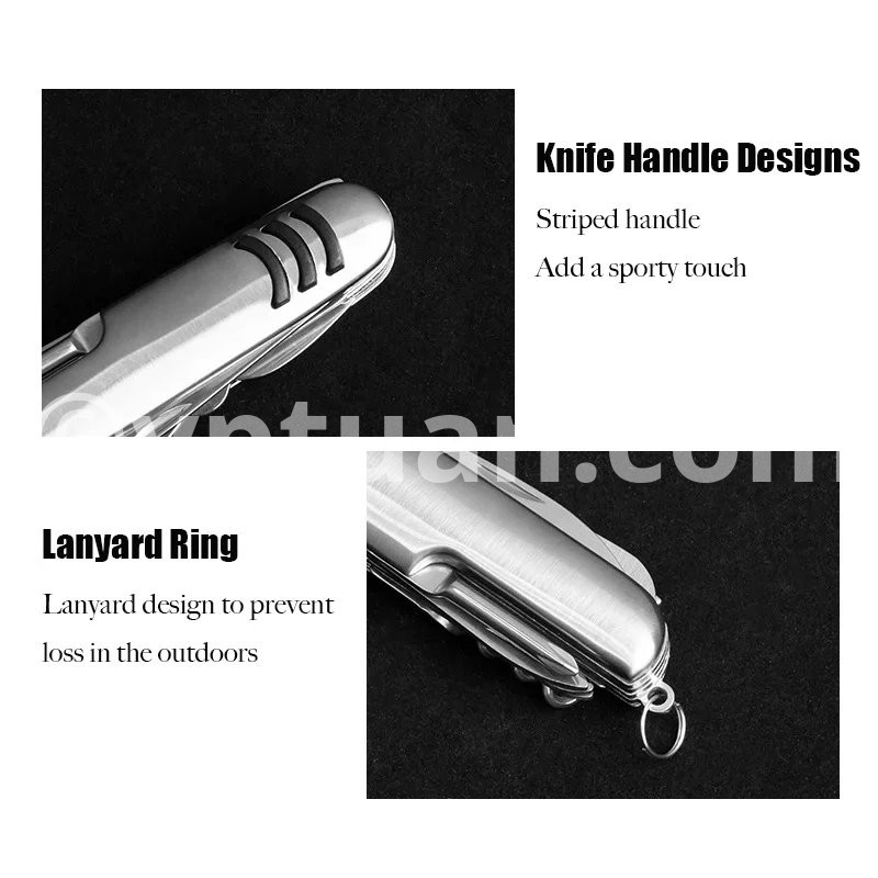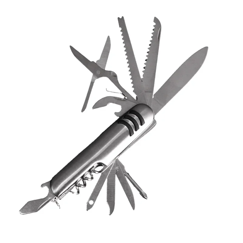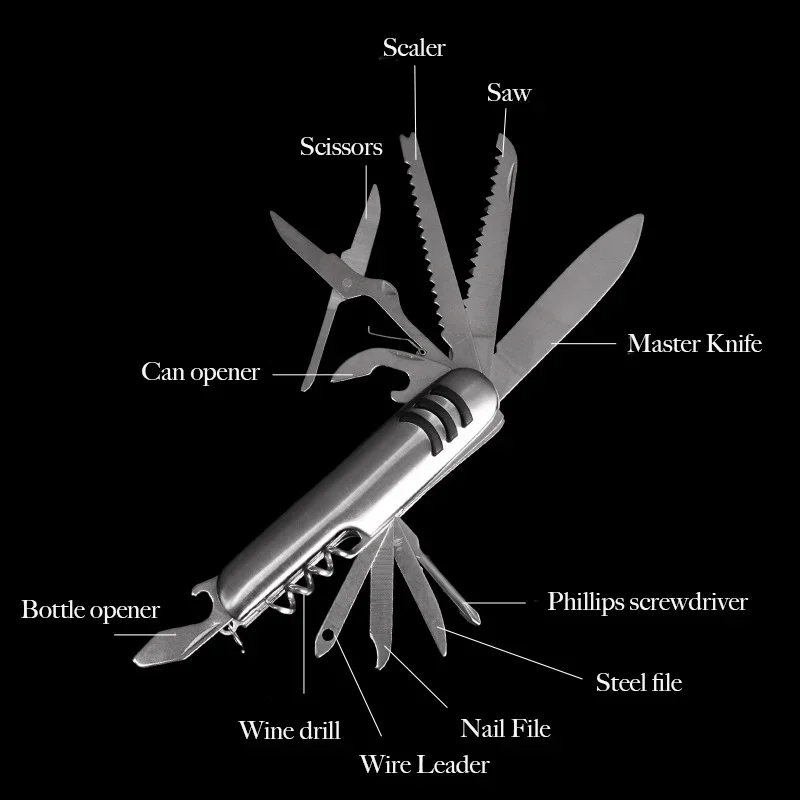This compact and versatile pocket knife is the perfect multi-tool for outdoor enthusiasts, campers, hikers and daily transportation needs (edc). Made of durable stainless steel, it is designed to withstand the rigors of outdoor adventures while offering a variety of practical tools in a convenient package. [key features] Functionality 11 in 1: this pocket knife features a wide range of tools, including: Main knife blade: for various cutting tasks. Saw: for cutting wood or other materials. Scissors: for fast and precise cutting. Scraper: for removing debris or cleaning. Can opener: for easy opening of canned products. Phillips screwdriver: for tightening screws. Steel file: for sharpening edges or filing. Bottle opener: to enjoy your favorite drinks. Corkscrew (wine drill): to open wine bottles. Nail file: for care. Thread/heart: to start holes or thread. Premium stainless steel construction: made of high quality stainless steel (including 20cr13 stainless steel), which guarantees superior hardness, durability, wear resistance, corrosion resistance and extreme temperature resistance. 20cr13 steel provides magnetic properties for greater functionality. Dynamic grip design: the handle features a dynamic stripe pattern for increased grip and improved sporty appearance. Portable and lightweight: with a weight of only 103 gy and a compact design, it is easy to carry in your pocket or backpack. Cord hole: equipped with a cord hole to hold a rope or carabiner, avoiding losses during outdoor activities. Versatile application: ideal for camping, hiking, fishing, hunting, diy projects and everyday tasks. Rust resistant: designed with antioxidant properties to maintain performance and appearance. [material and specifications] Material: stainless steel (including stainless steel 20cr1) Weight :103 g Tool count: 11 Characteristics of 20cr13 stainless steel: high hardness, high toughness, wear resistance, corrosion resistance, low and high temperature resistance, magnetic properties