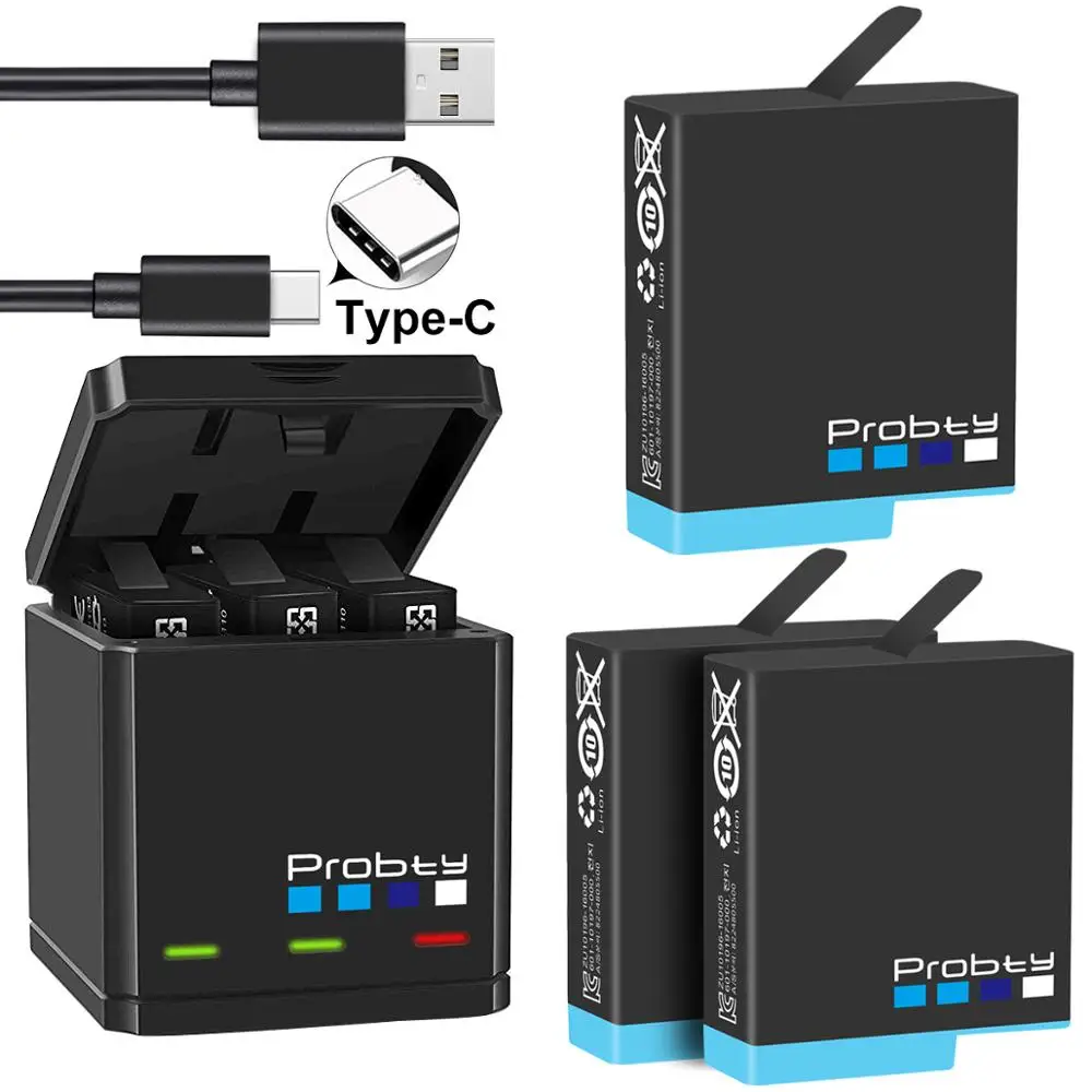 Feature: 1. 3 SLOTS: 3 slots charger can simultaneously charge up to 3 batteries. 2. Copper Plugs: made with premium copper to ensure high performance and stability 3. Charger can be powered by wall charger adapter, power bank, or your PC, Laptop, etc. 4. Type C interface: enables you to power the 3-channel charger with Type-C Cable 5. 100% safe circuit board protection 6.LED Charger Indicators:3 LED lights corresponding to 3 slots.Indicate RED color when the battery is charging; Indicate GREEN color when charging is completed. 7.Battery packaging upgrade,no pop-up window,Completely decoding 8.High Density Lithium Ion Cell. 9.Flame retardant material.safe and reliable. 10.Battery 100% Fits Hero 8,is the same size as the original battery. Battery: 1.Capacity:1680mAh 2.Material:Li-ion 3.Rated Voltage:3.85V Charger Specifications: 1.Input:5V 3A 2.Output:4.35V,800mAh*3 Package List: As your choose