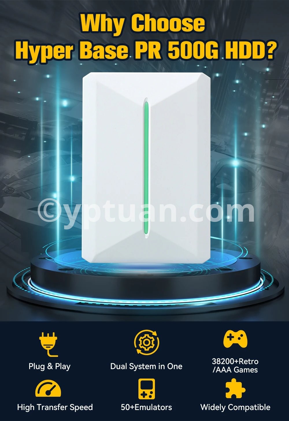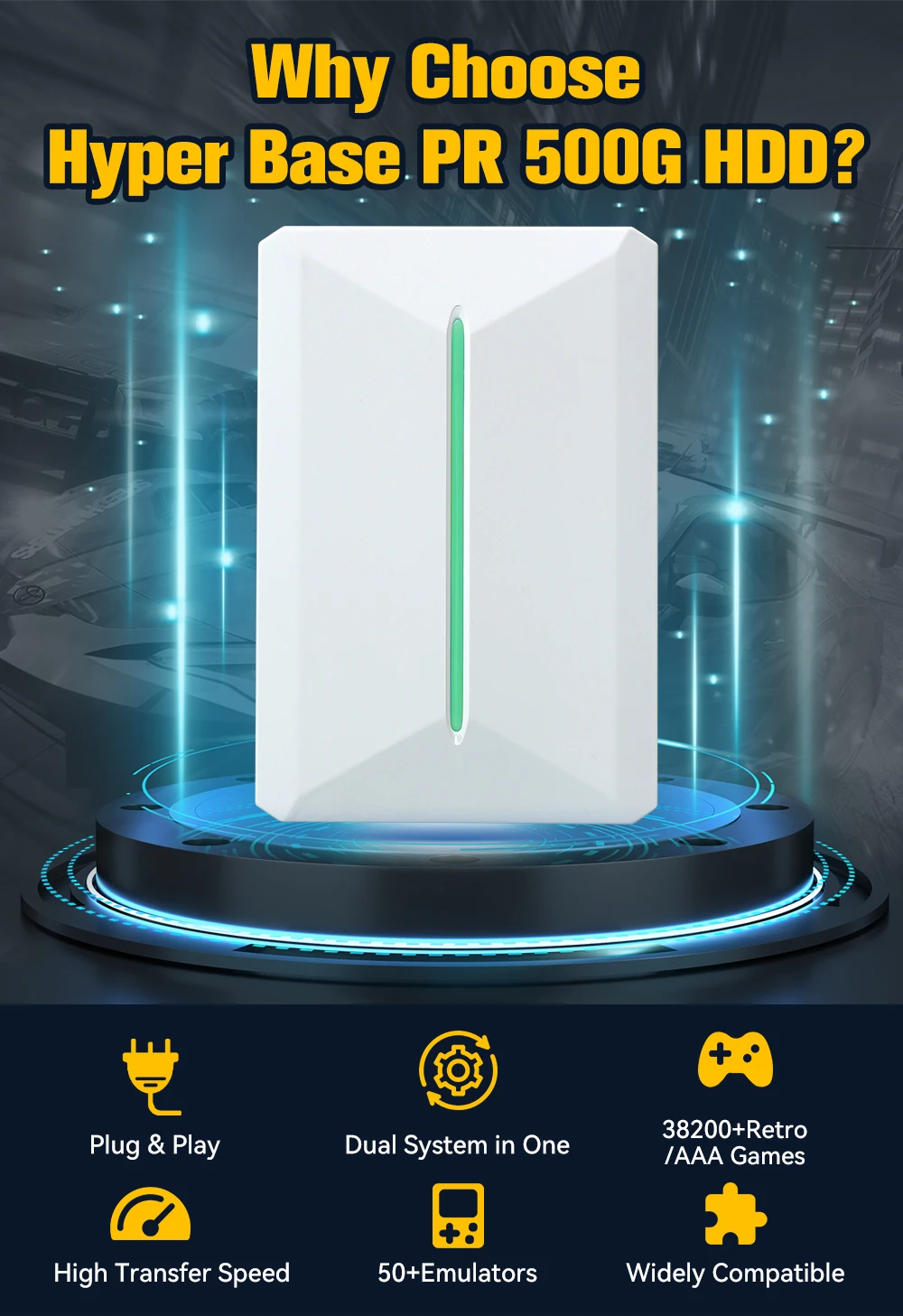 👉Hyper Base PR 500G HDD! Extremely cost-effective! The lowest priced dual front-end hard drive! 🎊 100% plug and play! No driver required, no need to download and install 🎊RetroBat & Playnite dual systems, compatible with various types of games 🎊 500GB capacity, built-in 38200+ games ✔ Playnite: 42 AAA games ✔Retrobat: 38200+ retro games 🎊Pre-installed 50+ emulators, suitable for PS3/PS2/PS1/SWITCH/WII/WIIU/Gamecube, etc. 🎊 Compatible with multiple device types (applicable to all-in-one computers, laptops, desktop computers, Win handheld computers) 🎊Support Windows8.1/10/11 🎊 SATA 3.0 to USB 3.0, up to 6GB/S, 128MB cache, speed up to 5400 RPM 🎊Rich DIY functions! Easy to add and remove games 🎁 Free game download resources! Expand your game collection! !