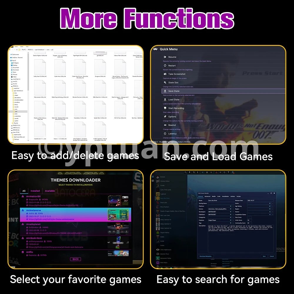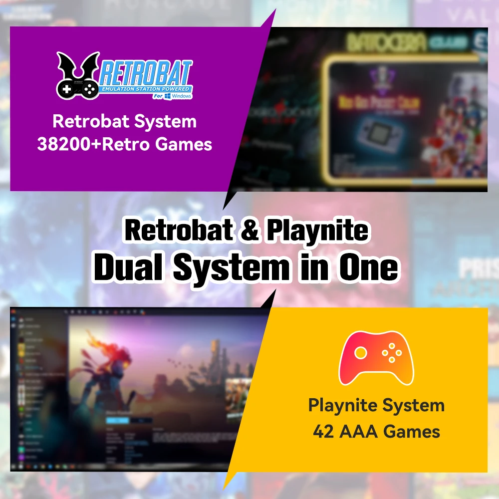 This portable video game console has built-in two powerful game front-ends, Playnite & Retrobat, which are compatible with various types of games. It is rich in functions, supports player DIY, and can meet the needs of players to a greater extent. Retrobat system 38200+ retro games pre-installed Pre-installed 49 emulators including PS3/PS2/WIIU/WII/Switch/DC/N64 Playnite system 42 AAA games pre-installed Computer Games & AAA Games
