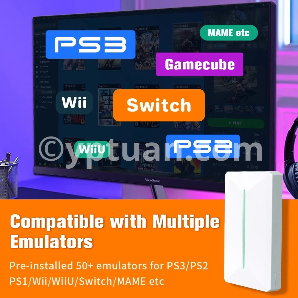 Hyper Base PR500GB is pre-installed with 50+ emulators, running PS3/PS2/PSP/Switch/Wii/WiiU/Gamecube/MAME etc perfectly