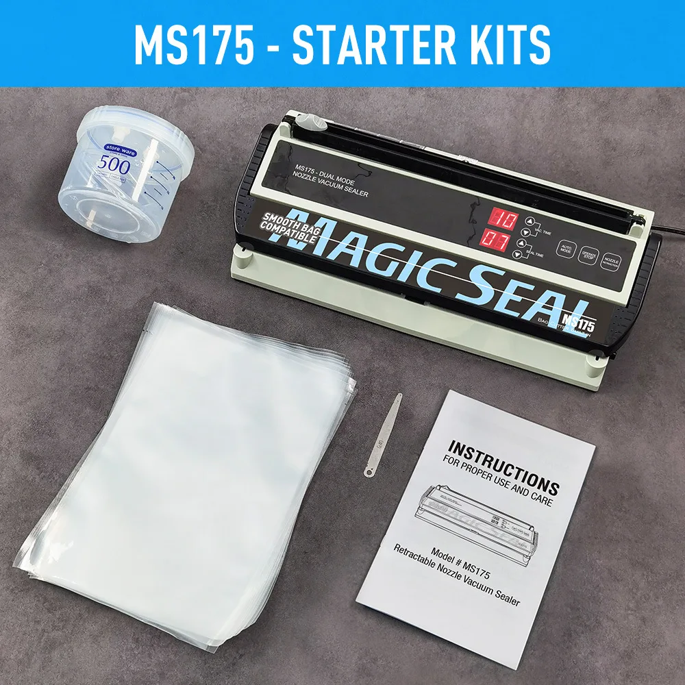 *At present, the 8mm wide sealing line of MAGIC SEAL MS175 has been changed to 5mm. To reduce the heating burden of electric heating wires.Please be informed. 1.MS175 vacuum sealing machine is applicable to smooth surface vacuum bags. Advantages of smooth bag: low cost, various forms. 2.The sealing strip will heat up when vacuuming, please do not touch it during use to avoid burns.