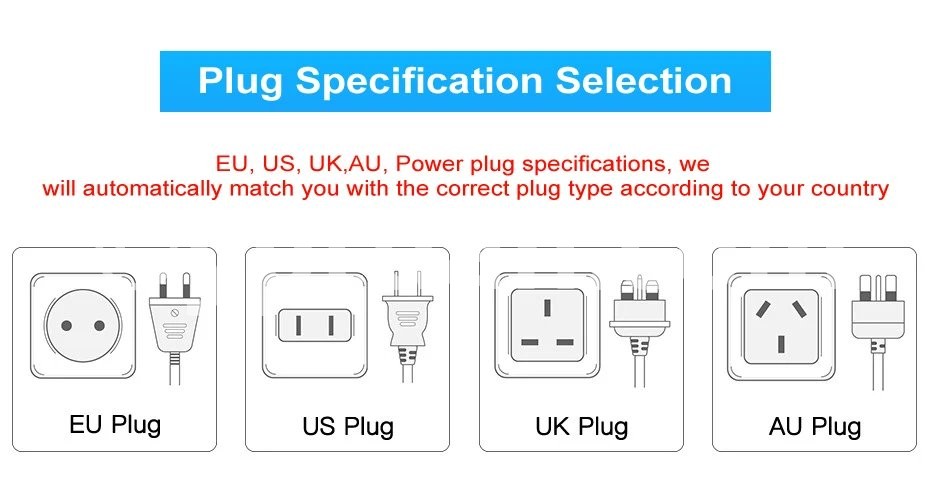 We provide 4 kinds of plug specifications, US standard, UK standard, European standard, Australian standard,you can choose the suitable type according to your plug.