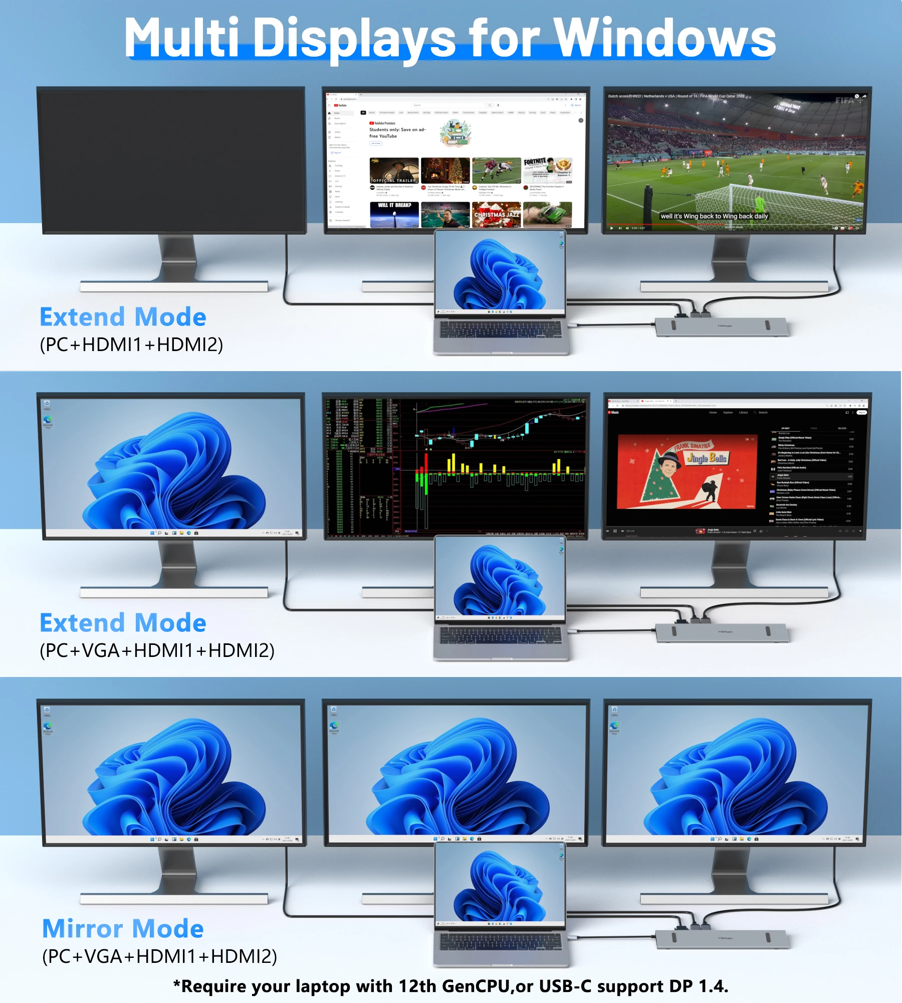 USB C Docking Station Dual Monitor: Windows system support MST and SST(Mirror & Extend Mode). Single use or dual HDMI can up to 4K under DP1.4 source. HDMI resolution will be 1080P@60Hz when dual or triple display with VGA. Please note: Mac OS DOES NOT support triple display, it only support mirror mode and non-mirror mode. Non-mirror mode means that the three external monitors are same but different from laptop.