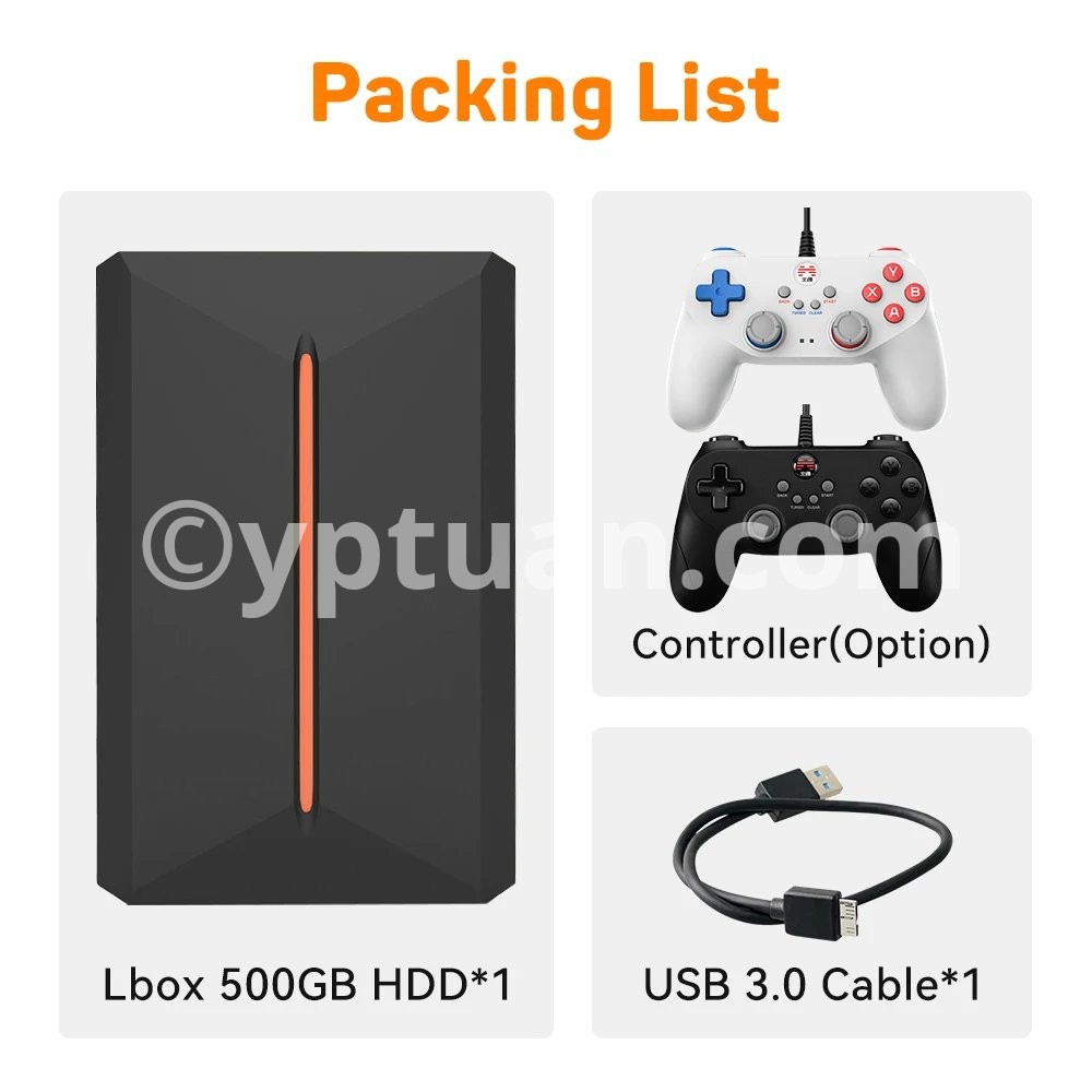 Lbox 500GB HDD*1 Game Controller*1 USB 3.0 Cable *1