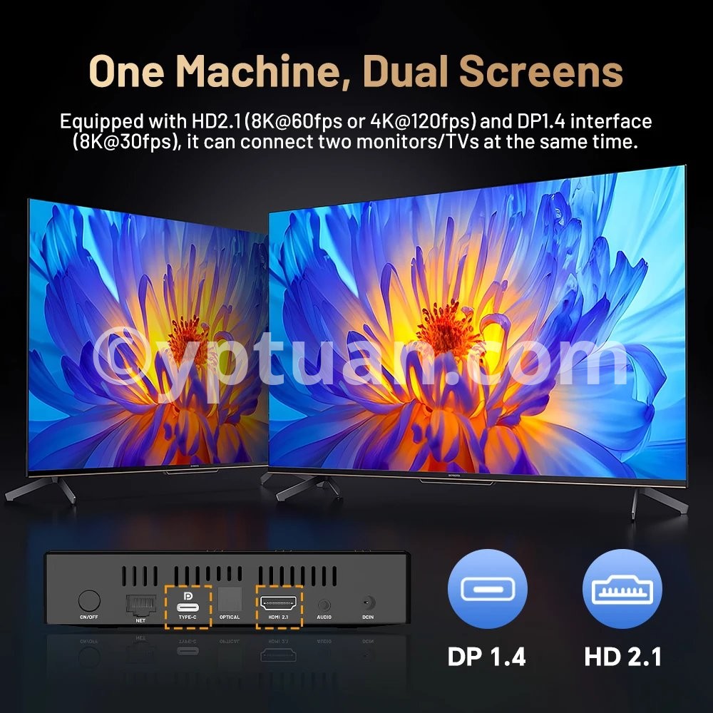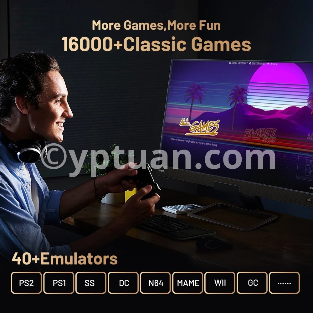 Rich Games: - 40+Emulators: PS2/PS1/DC/SS/MAME/WII etc. -16000+Games(4T): more games more fun. Configuration Advantages: - Rockchip RK3588 4×Cortex-A76+4×Cortex-A55; - GPU: ARM Mali-G610 MP4 ; - OS: Android TV 12; - LPDDR4x 8GB, eMMC 64GB; 1000M Ethernet & decoding 8K video: - 8K@60fps Video, 4K@120fps, HDR10, AV1; -1000M RJ45, WIFI6 2.4G & 5G Wifi, BT5.0; - HD2.1& DP1.4 Dual screen display; - SATA3.1 Support connection of up to 18TB HDD
