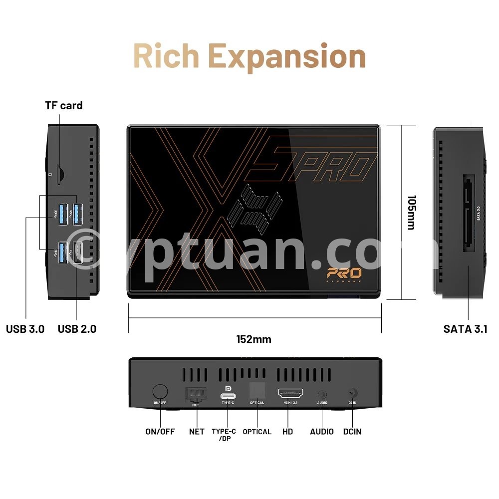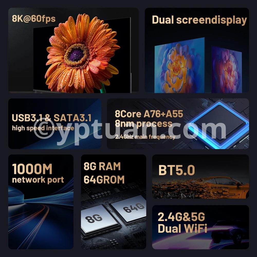 • Pre-installed 10000+(320G)/16000+(4T) classic games, suitable for 40+ emulators such as PS2/PS1/DC/MAME/ARCADE • CPU:4×Cortex-A76+4×Cortex-A55 • GPU:ARM Mali-G610 MP4 • 8G LDDR4 + 64G EMMC • 8K@60FPS, 4K @120PFS, AV1, HDR10 • 2.4G/5G dual-band WiFi, Gigabit network, BT5.0 • Equipped with HD2.1&DP1, capable of dual-screen display. • USB3.1&SATA3.0 interface, faster transmission speed