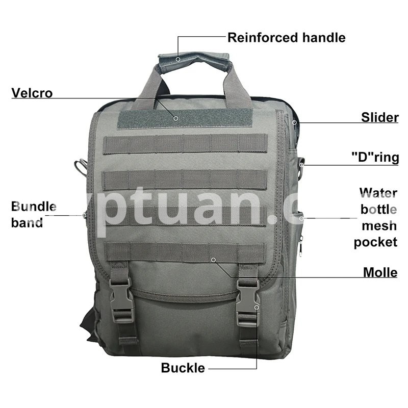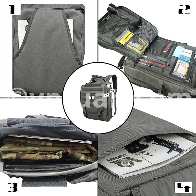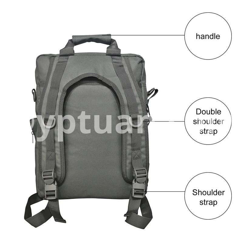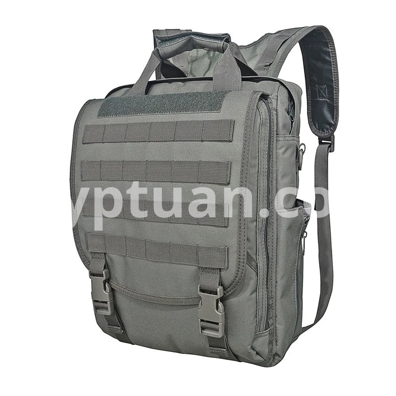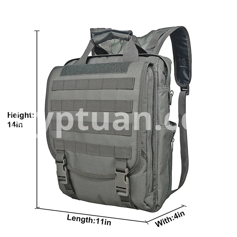 Multi-function military laptop backpack/bag with fast release buckles and zipper closure design. Comes equipped with straps to be carried by either single or both shoulders. Also, has reinforced 1.5" wide grab handle on the top. Multi-function water resistant computer bag. Built with sturdy construction and superb load carrying comfort. Multiple compartments for packing all your extra small and medium sized items. The sleek design allows you to take your laptop computer bag almost anyplace.