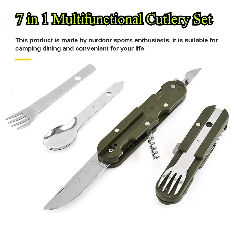 Dear customer, Welcome to our store, and if you have any questions, please feel free to contact our store's customer service. We believe we can provide you with a satisfactory response and solution. Thank you, have a nice day! Outdoor Cutlery 7 in 1 Multifunctional Portable Knife Spoon Fork Opener Can Opener Camping Hiking Trip Picnic Folding Cutlery Set Specifications: Product name: 7 in 1 folding knife Color: Army green Size: about 11*3*2cm Material: Stainless steel Function: Folding knife, fork, spoon, bottle opener combination The package includes: 1 * outdoor tableware 1 * Oxford bag Features: 1. Folding multifunctional outdoor tableware, including knife, fork, spoon and beer bottle opener and other complete equipment. 2. Tableware can be folded, small size, portable, outdoor application is convenient and fast. 3. Buy cutlery and send Oxford storage bag, which does not occupy space reasonably. 4. The tableware is made of stainless steel, which is not easy to rust and durable. 5. Suitable for picnic, hiking and other outdoor occasions, convenient for your life. Notes: 1. Due to the different monitor and light effect, the actual color of the item might be slightly different from the color showed on the pictures. Thank you! 2. Please allow 1-3cm measuring deviation due to manual measurement.