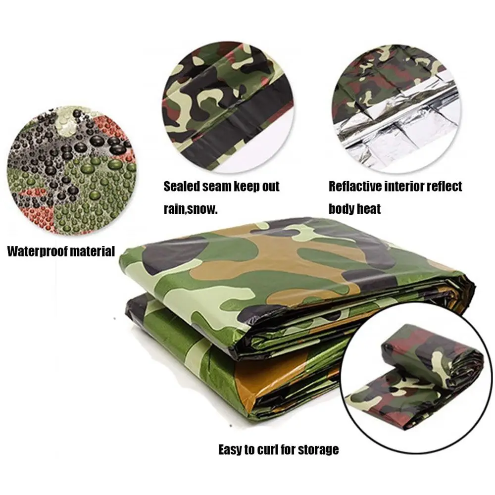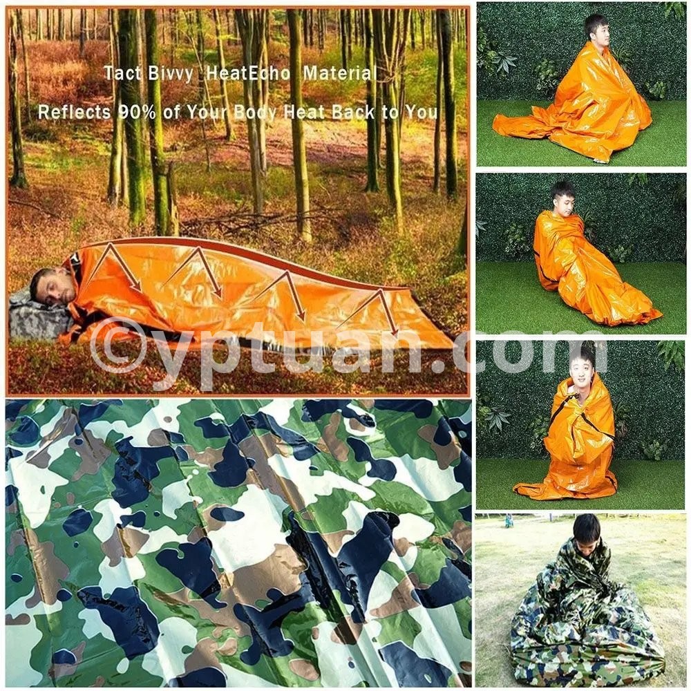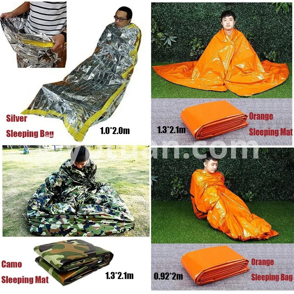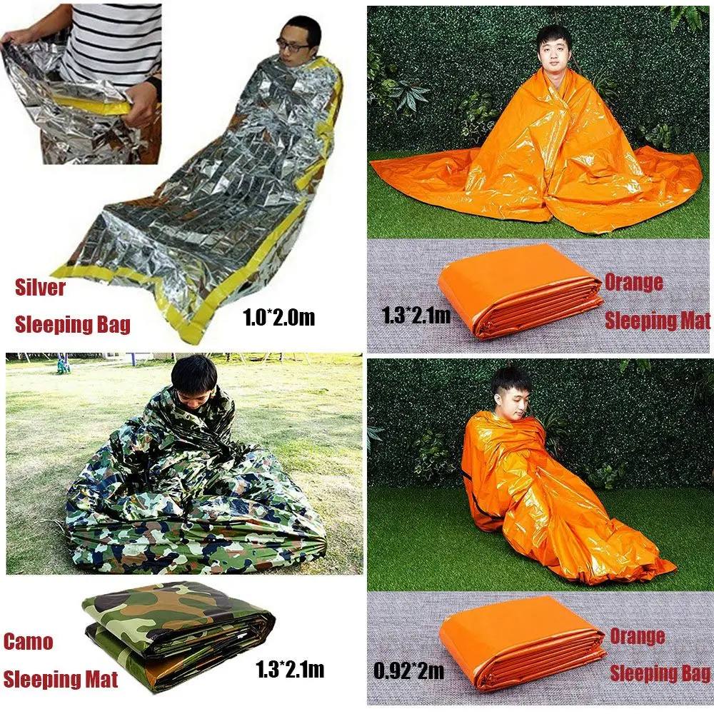 Brand new with high quality Material: PE (tear resistant material, can be used repeatedly) Color: Orange/Silver/Camo Style:Sleeping Bag/Sleeping Mat Quantity:1pc This material can be used repeatedly for a long time. It is not easy to break. Size: Silver sleeping bag:1*2m Orange sleeping mat 1.3*2.1m Camo sleeping mat 1.3*2.1m Orange sleeping bag:0.92*2m Feature: 1.Ease of use Easier than an emergency space blanket, Just pull out of the stuff sack, unroll and climb inside. emergency sleeping bag can be used as a sleeping bag liner to keet your body temperature. This sleeping bag is small and lightweight, easy to carry and store. 2.Durability Emergency survival sleeping bag kit is constructed of 26um extra-thick PE material, waterproof and reusable. It can be folded up and placed back inside the waterproof Nylon stuff sack for your next adventure. A must-have tent camping gear when Camping, Hiking and Outdoor. 3.Keep Body Temperature Emergency sleeping bags are made from durable reflective polyester film that can increase your body temperature to 20 degrees in cold and harsh weather conditions. It is a must for bad weather and outdoor adventures such as wind, heavy rain and heavy snow. 4.Made for Emergencies Multipurpose used as a survival emergency blanket, poncho, emergency shelter and more, Suitable for your bug out bag. The bright orange color of the outer shell of this sleeping bag is essential to help rescuers find you. Packaging content: 1×Survival sleeping bag Notice: 1.Transition: 1cm=10mm=0.39inch. 2.Please allow 1-2mm error due to manual measurement and make sure you do not mind before ordering. 3.Please understand that colors may exist chromatic aberration as the different placement of pictures.