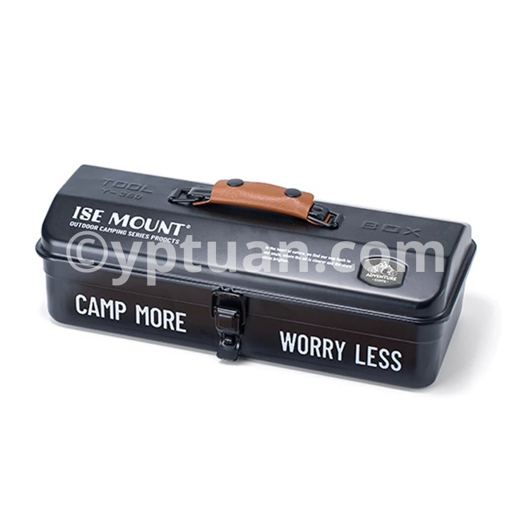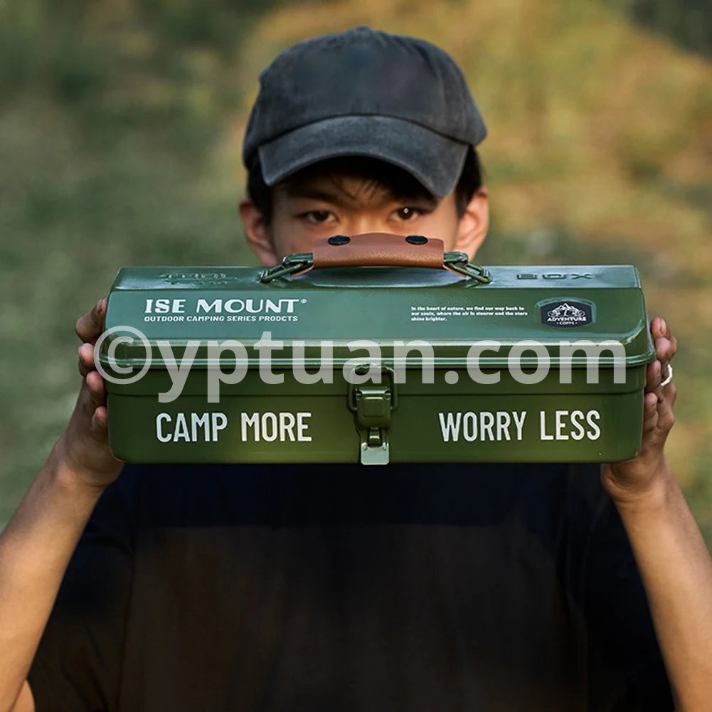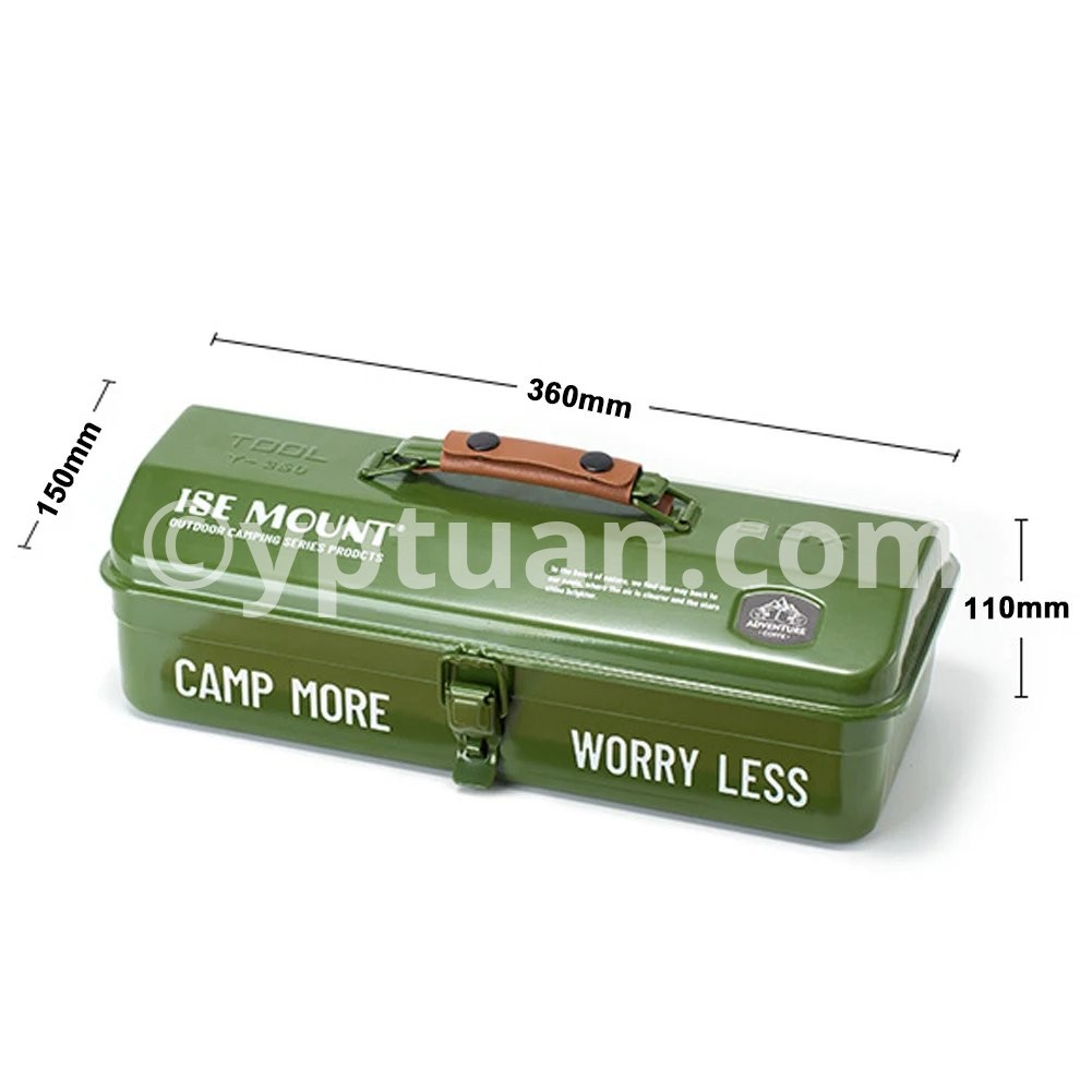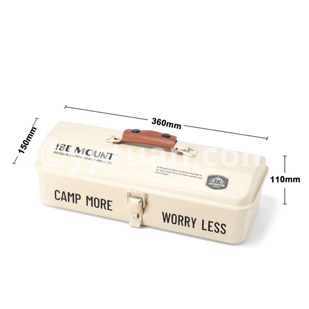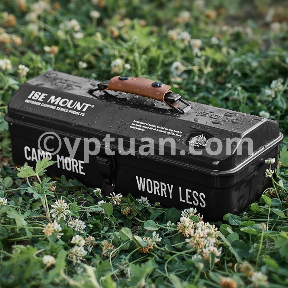 This is an iron storage box, sturdy and wear-resistant, with a handle for easy carrying. The interior is lined to protects the items inside, making it perfect for outdoor use.