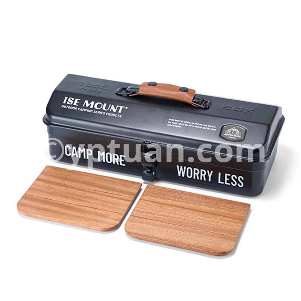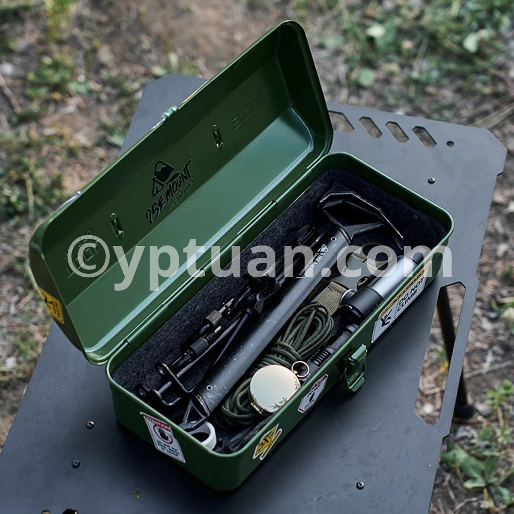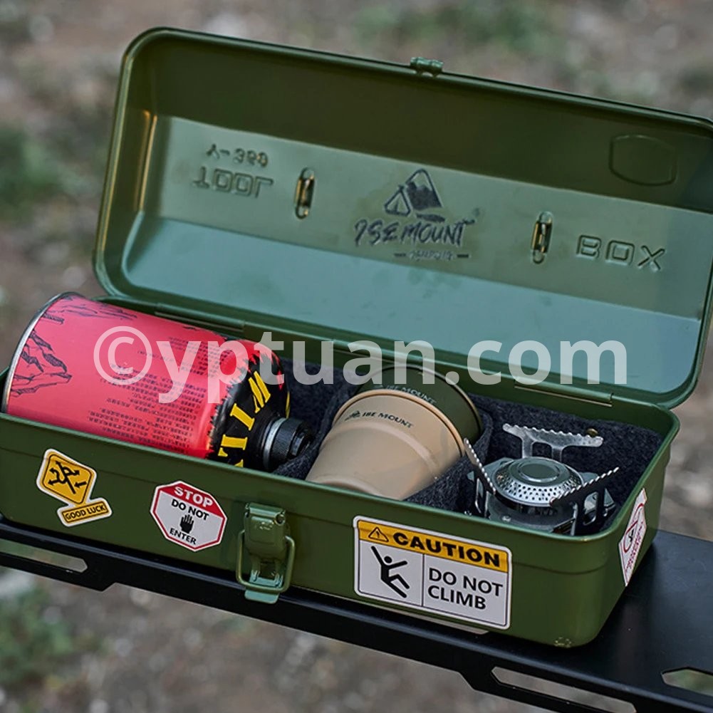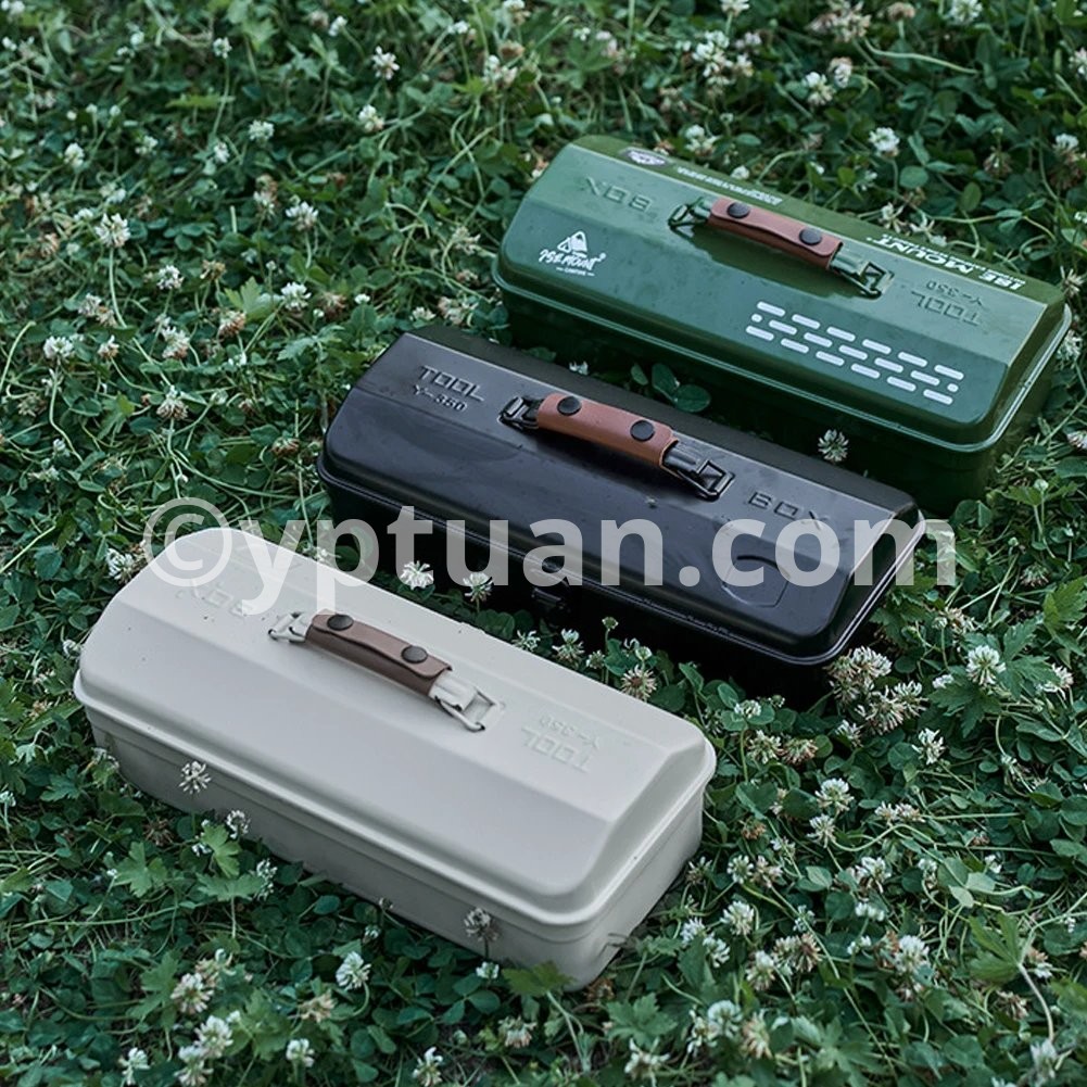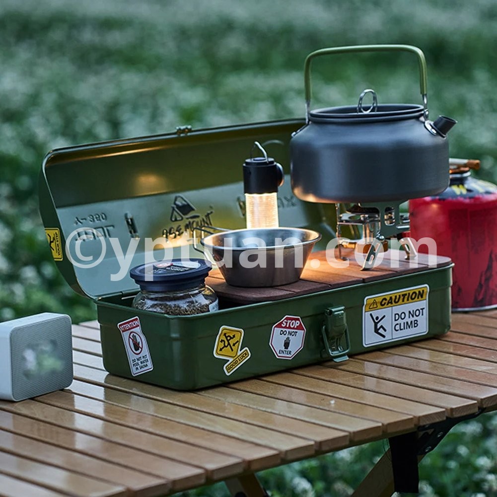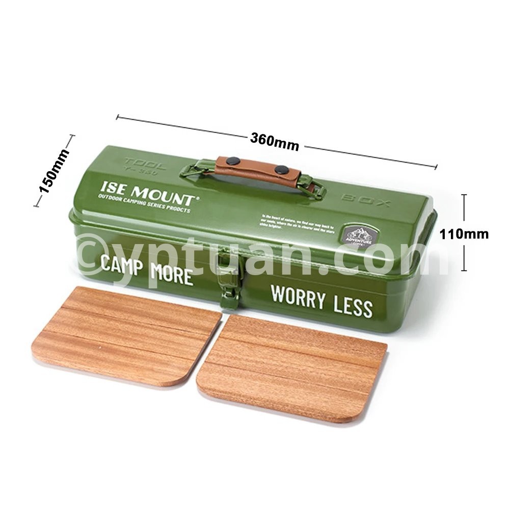This is an iron storage box, sturdy and wear-resistant, with a handle for easy carrying. The interior is lined to protects the items inside, making it perfect for outdoor use.