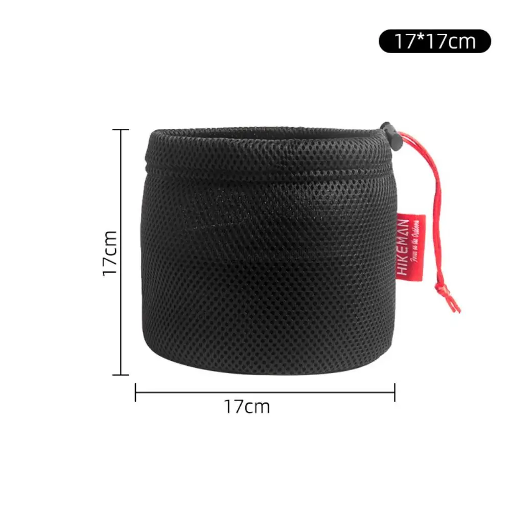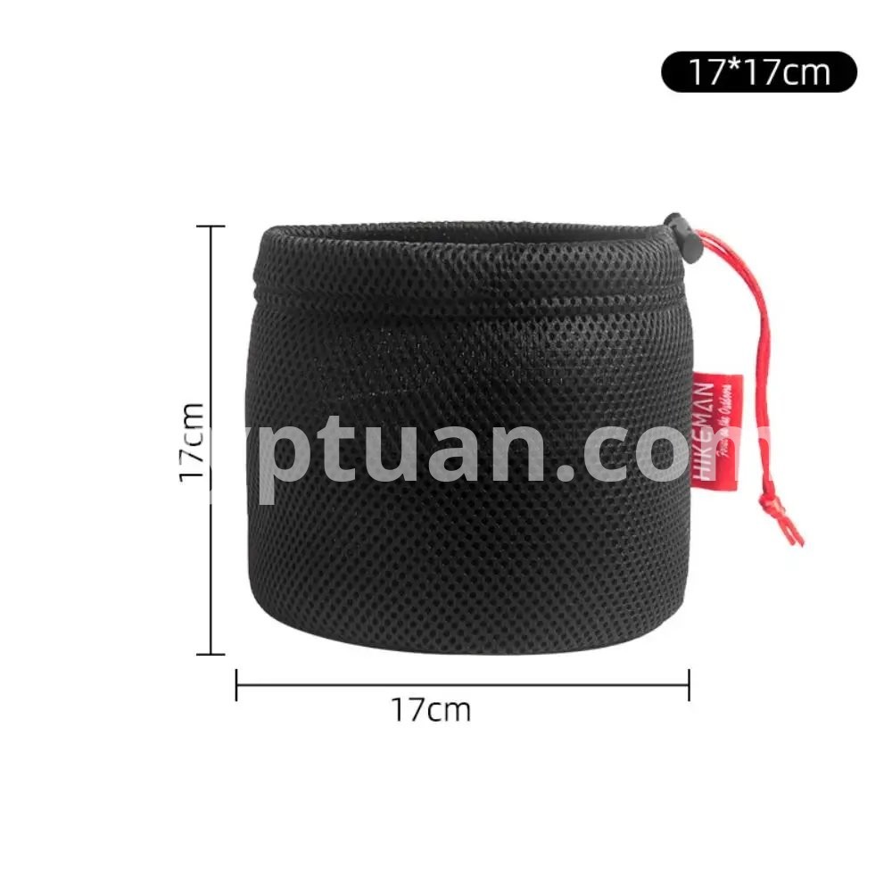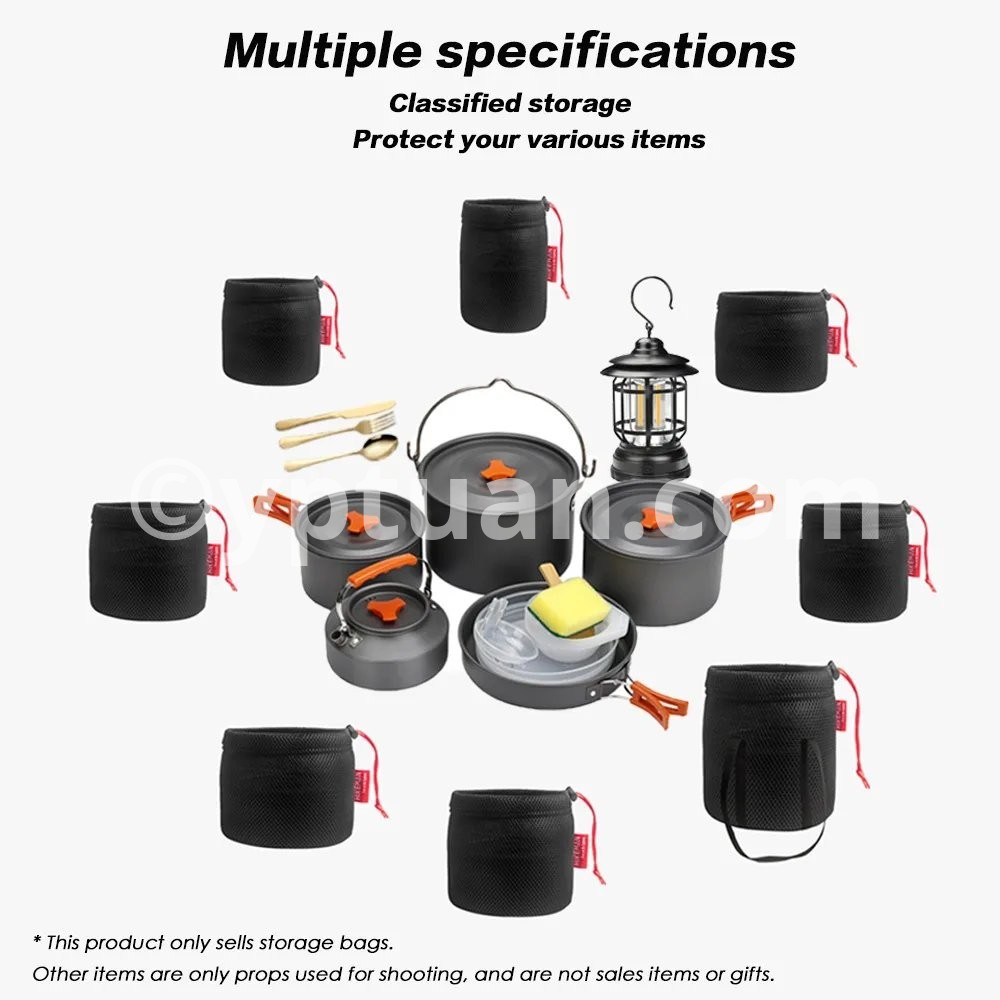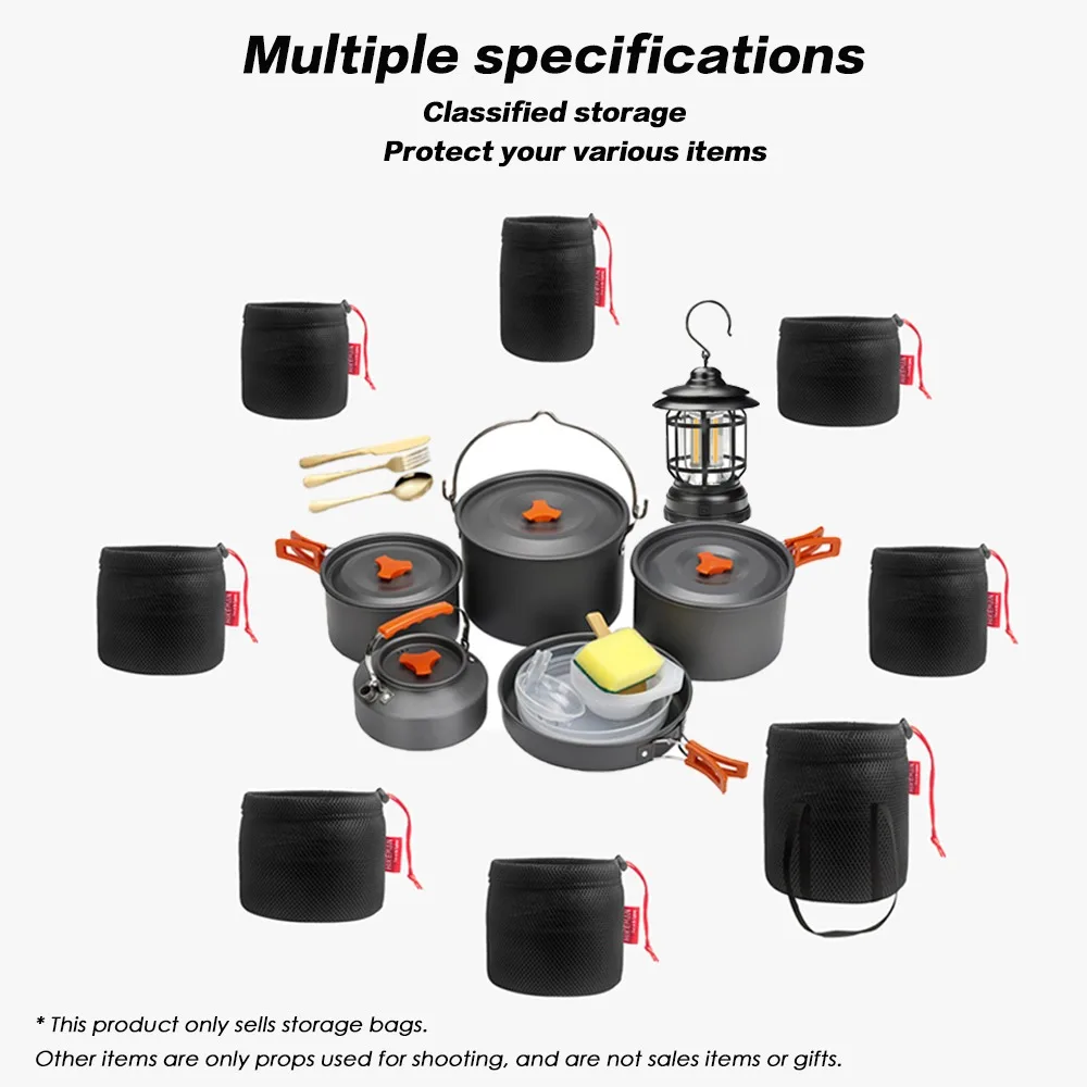 Material: Mesh Dimensions: As indicated in the diagram Color: Black Quantity: 1Pcs Name: Camping set pot storage bag The packaging includes: 1 * Camping storage bag Features: This is a storage bag suitable for outdoor camping supplies, which comes in many sizes for you to choose from. It adopts sandwich mesh fabric, which is sturdy and durable, has good collision resistance, and has good elasticity. The bag opening has a rope that is easy to pull and tighten. It can be used to store stoves, pots, and tableware, making them less prone to scratches and avoiding paint peeling or breakage. Of course, you can also use it to store any items worth protecting.