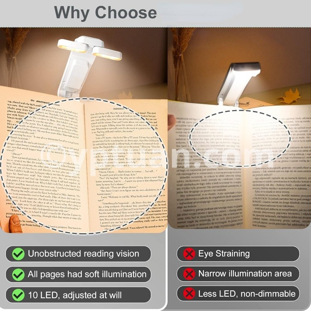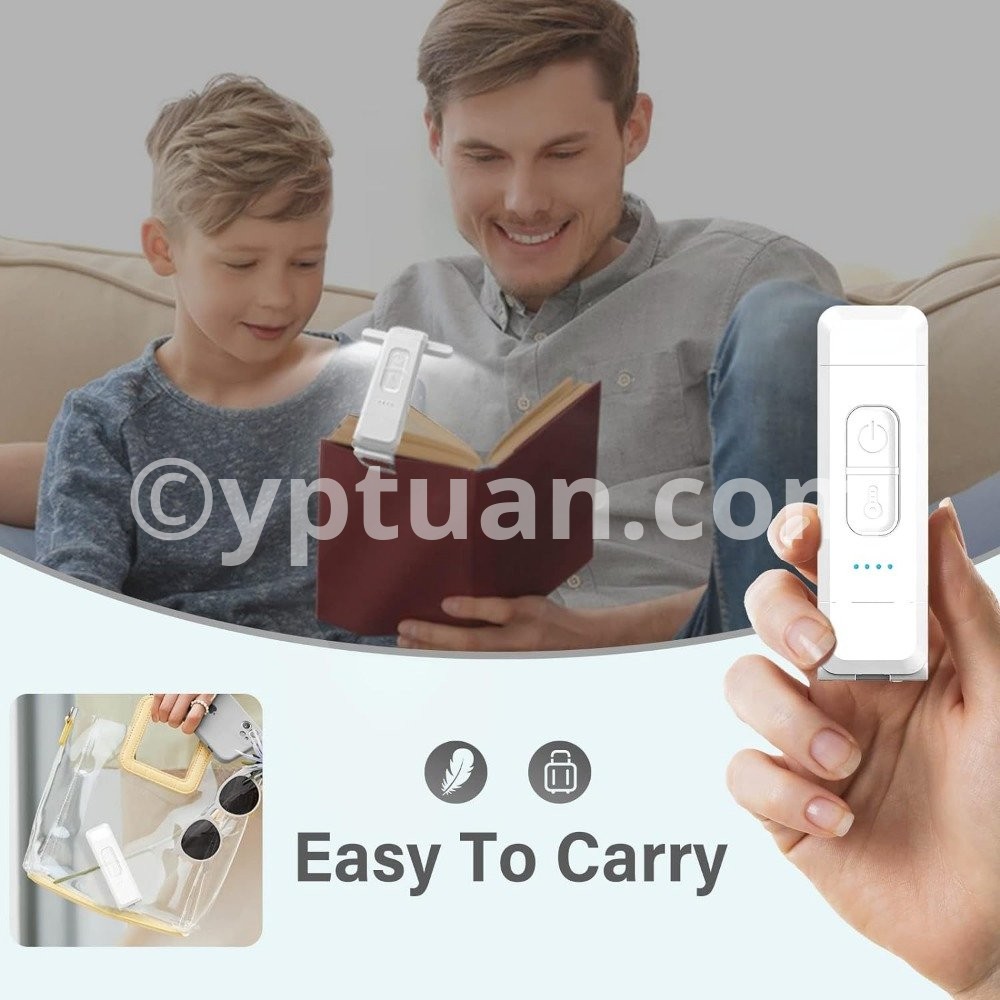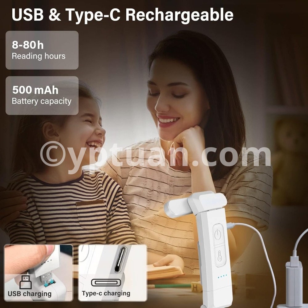 The book light not only has a USB charging port that is compatible with any USB port, USB socket or adapter on your computer, but also has a Type-C plug for charging. This rechargeable book light has a built-in 500mAh battery that provides you with 8-80 hours of reading time and 4 power indicators to show the remaining power.
