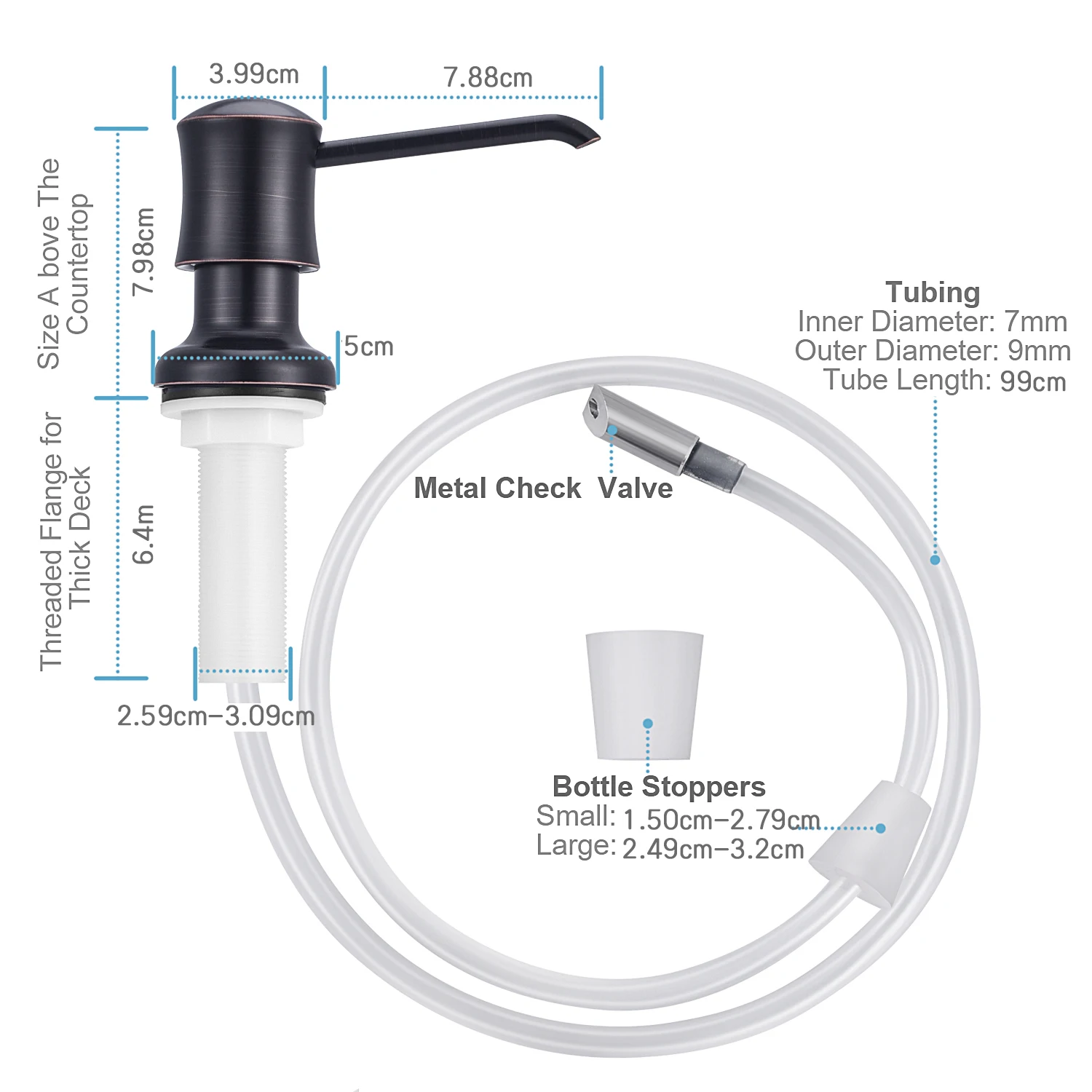 Max capacity: Your oringnal bottle Threaded Tube Length: 6.4cm Hole Size Range: 3.1cm﹤size﹤5cm Material: Pump-head(ABS)+ 100cm Extension Tube+ bottle stoppers*2+Funnel