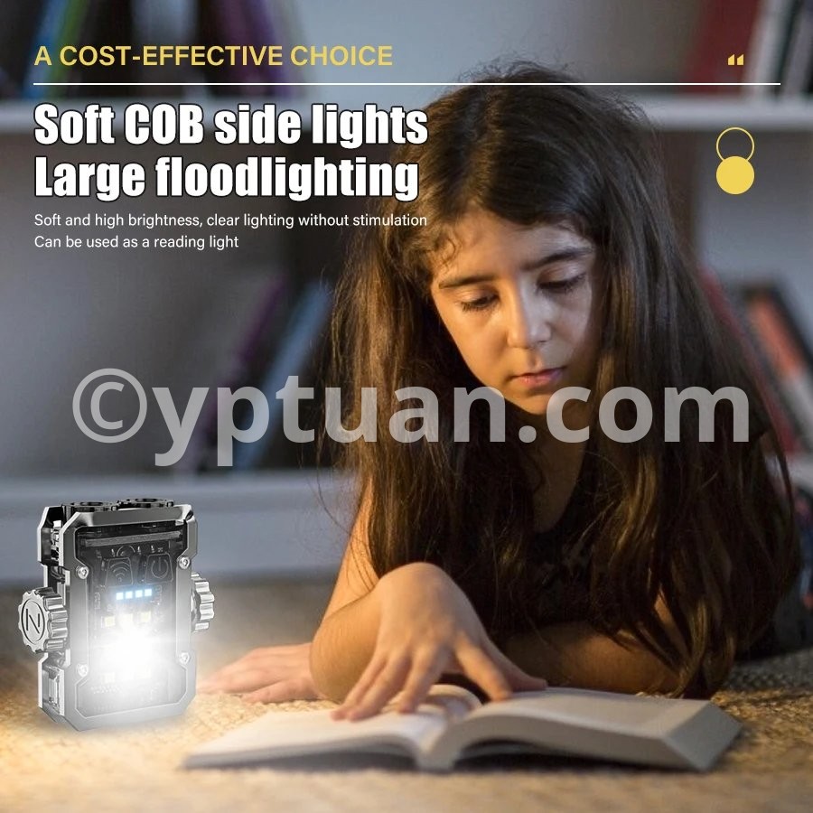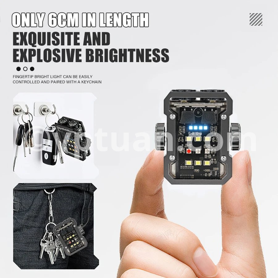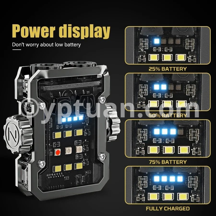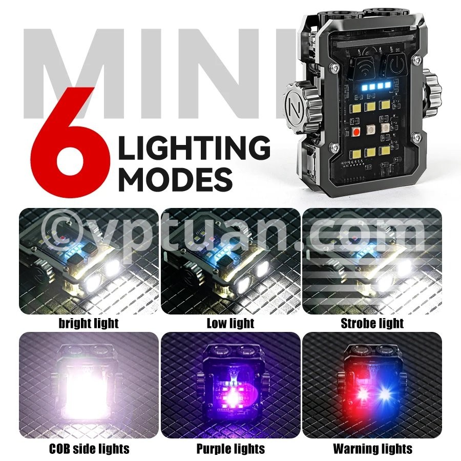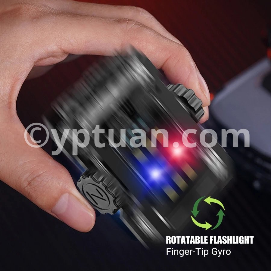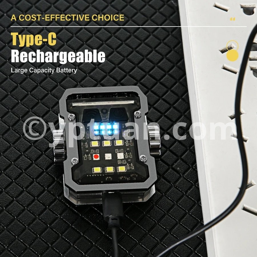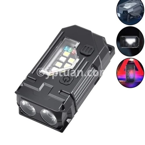 Product parameters Product Name: Multi functional Mini Work Light Product color: Black Using wick: COB+LED Battery: Built in polymer lithium battery (500mah) Charging method: Type-c interface Charging time: approximately 3 hours Shell material: ABS Waterproof level: Domestic waterproof level (IPX4) Net weight of the product: approximately 50g, gross weight 70g Product size: 55 * 60 * 26mm Features: Bottom magnet -180 ° adjustable- Power display:25%-50%-75%-100% Switching mode: Dual control switch(Main light switch - side light switch) Additional function: Rotating gyroscope Gear switch: Click to turn on the flashlight Main light: strong light - weak light - flashing Side lights: white light-UV light-red blue flashing