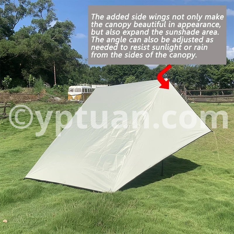 Features: 1. Plaid fabric, strong and lightweight. 2. Three layers of black glue coating on the back of the fabric block almost all sunlight and ultraviolet rays, providing a super cool shading effect. The performance far exceeds that of silver-coated fabrics on the market. 3. The unique double-wing design not only prevents the sun from slanting but also prevents rain from falling, and it also has better wind resistance! 4. It provides a maximum shading area of 8 square meters, which is enough to provide shade for 6 people and meet the needs of family travel. 5. A variety of accessories are available in the set, allowing buyers to flexibly choose the version that suits them.