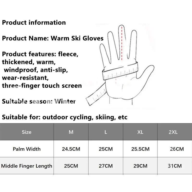 Feature 1.Windproof and waterproof: Adjustable buckles, wrist straps and drawstrings can be closed more tightly, effectively preventing outdoor cold air. The waterproof TPU insert bag also keeps your hands dry. Keep your hands dry in snowy, sweaty, damp or rainy conditions 2.Function: All fingers are designed with high-quality materials, there is no need to take off the touch screen gloves when skiing or other winter sports. Very suitable for outdoor work, motorcycles, cycling, cycling, skiing, mountaineering, hiking, outdoor sports, etc. 3.Warm gloves: Men's and women's winter gloves are made of 3M thermal insulation cotton and skin-friendly thin layer fleece lining to ensure that you stay warm outdoors, skiing or snowboarding. 4.Designed for skiers of all levels. The ski gloves are very flexible, which means that every movement feels natural and has good thermal insulation, which is very suitable for skiing, snowboarding, snow shoveling, outdoor work in cold weather. 5.Extremely warm winter gloves: The winter ski gloves are filled with 260 grams of acrylic cotton. The thick and smooth inner wool can withstand temperatures from -30°F to -4°F. Size: M Palm width: 24.5cm Middle finger length: 25cm Size: L Palm width: 25cm Middle finger length: 27cm Size: XL Palm width: 25.5cm Middle finger length: 29cm Color: Black, grey, brown, camouflage. Package: 1 * pair gloves.
