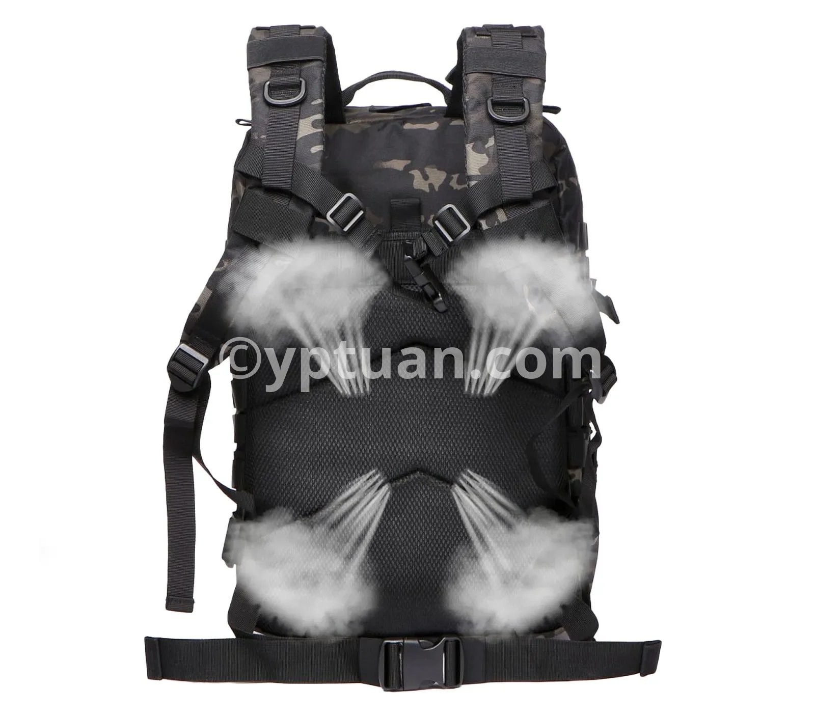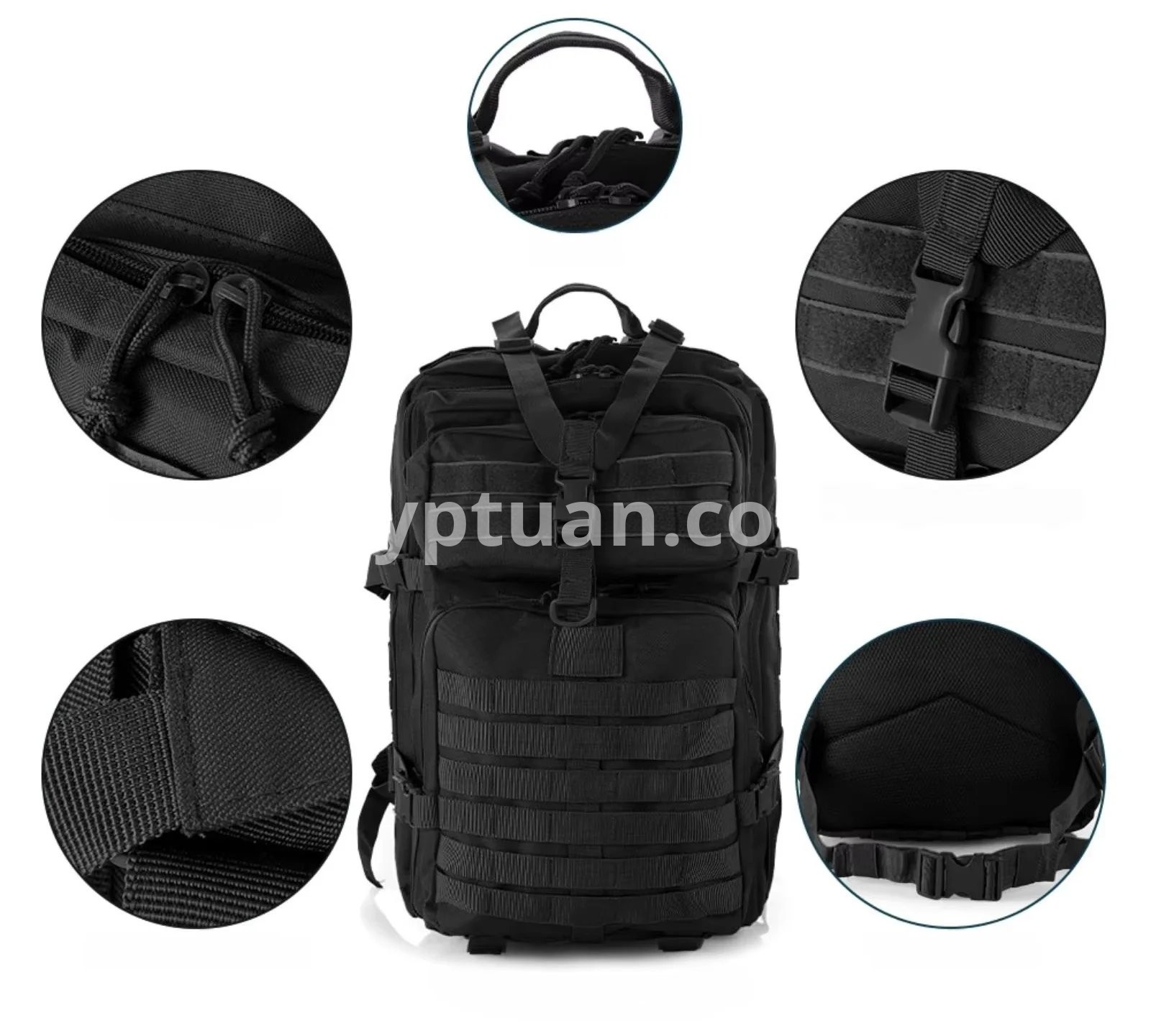 **Thoughtful Tactical Features** • Reinforced stitching and durable zippers ensure long-lasting performance under demanding conditions. • Elastic straps on front, sides, and shoulder straps enable quick load adjustments and secure gear fast. • Multiple organizing compartments—including internal water bottle pocket, zipped front pocket, side pockets, and internal tactical organizer—allow for convenient storage of essentials like camping gear, electronic devices, hydration bottles, or snacks.
