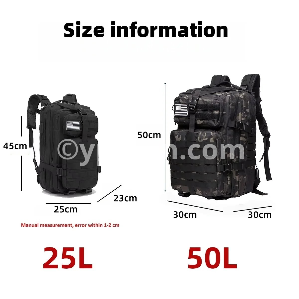 • Material: Heavy-duty Oxford cloth with waterproof coating • Color: Available in multiple options (refer to product images) • Dimensions: Please consult size guide (note: size tolerance ±1-3cm) • Weight: Ultra-light yet durable for intense outdoor activities