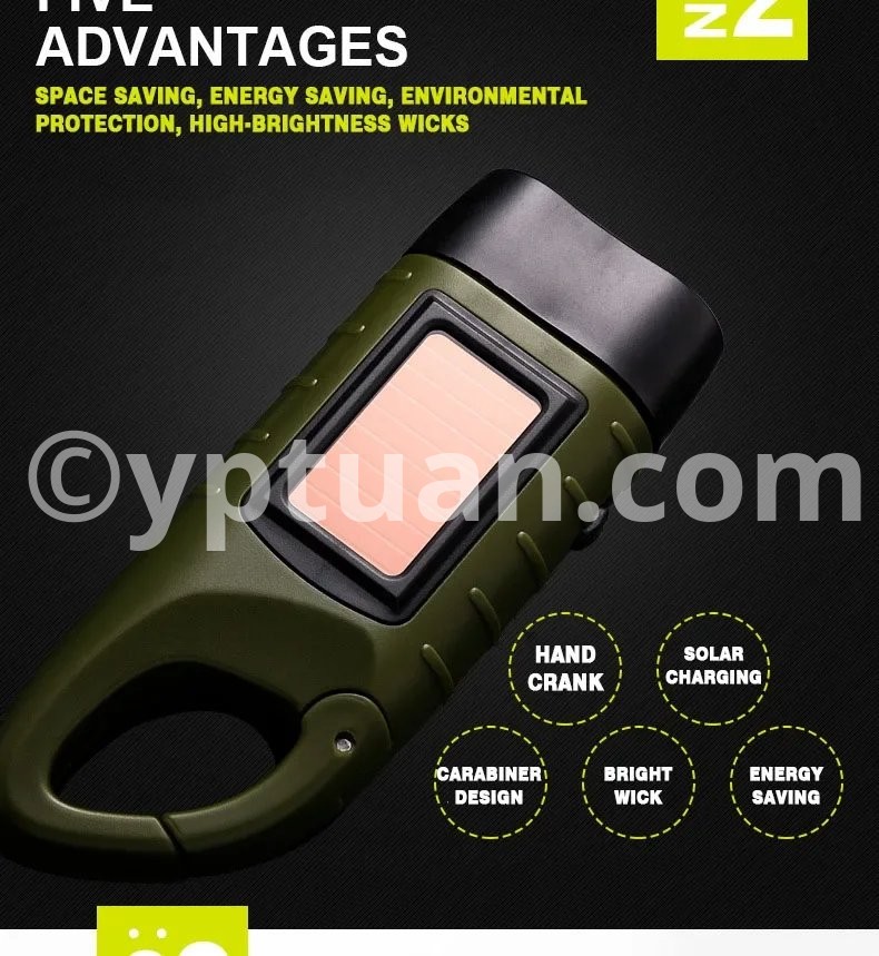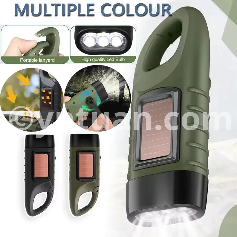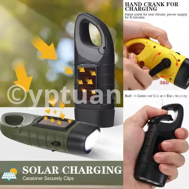 Specification: 【Model】:YJ-D295 【Wick】:LED 【Material】:ABS Plastic 【Weight】:90 【Battery】:Built in large Capacity Lithium Battery 【Charging】:SOLAR Rechargeable 【Modes】:1 MODES Features: 【Solar 】:A flashlight with solar and hand-crank charging. With the built-in battery, you can save energy for a long time without an external battery. Using crystalline silicon solar cells, the material is a solar cell panel laminated with tempered glass. 【 Design】: The hand crank handle can be put and retracted, and the hand crank handle can be put in the groove, which is very convenient for storage. Classic design, durable, outdoor survival gear, the best gift for outdoor activities. 【 Energy saving】High conversion efficiency, 6 minutes to start for an hour, enough light for the flashlight, easy to use in the dark. Space saving, energy saving and environmental protection, the high-bright wick will never power off. The Package includes: 1 pc * solar hand crank flashlight