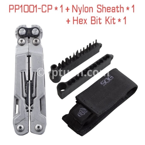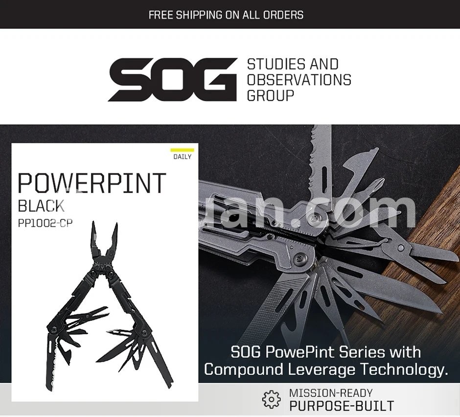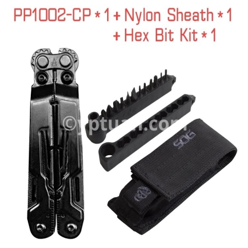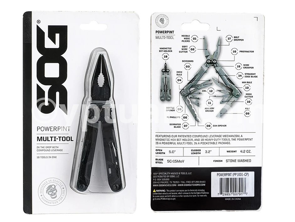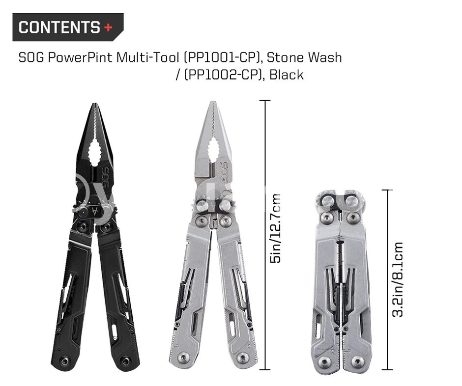 The PowerPint is a mini multi-tool with that delivers full-sized utility. The Pint comes equipped with 18 tools and a magnetic hex bit holder. And of-course it features SOG's Compound Leverage that provides smooth open and close and increased gripping power. At only 5” long and a lightweight 4.2 ounces, the PowerPint is an all-around multi-tool that's great in your pocket, your pack, on the tool bench, or around the house. Also available in a black coating. Item PP1001-CP/PP1002-CP