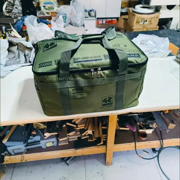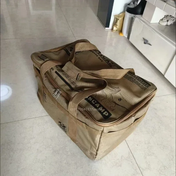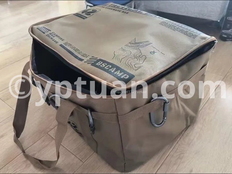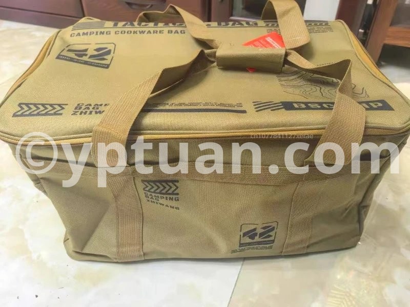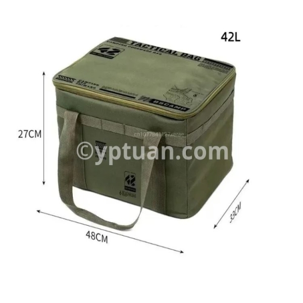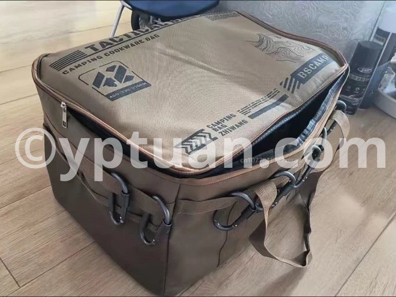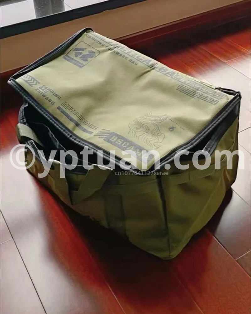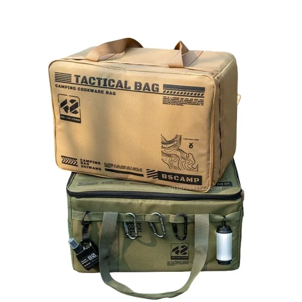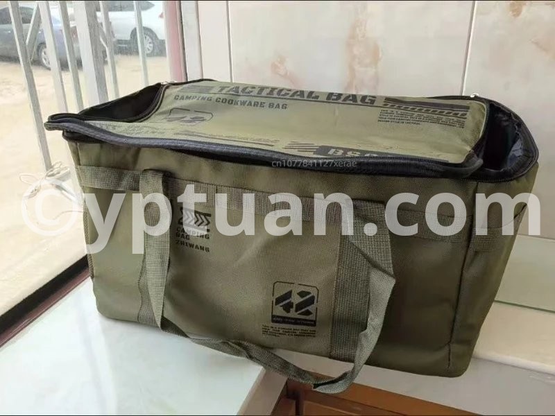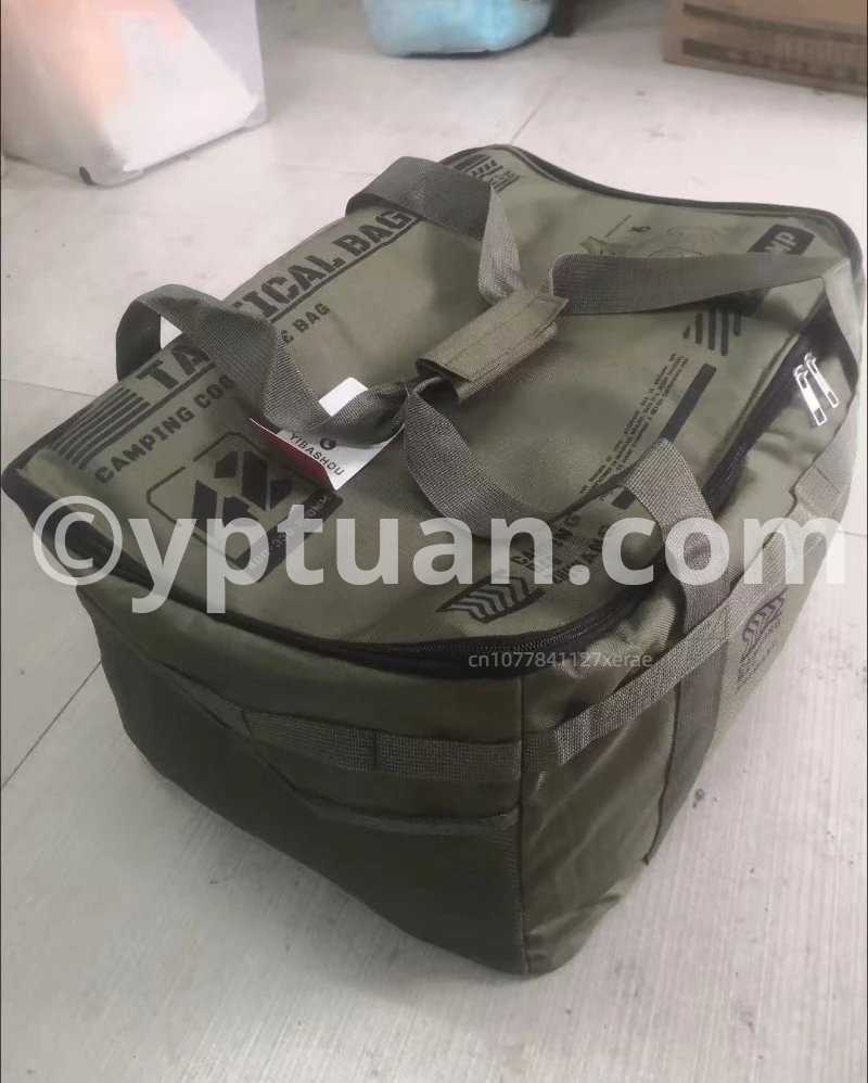 A large-capacity tactical storage bag suitable for camping outdoors, used for storing cooking utensils and tableware