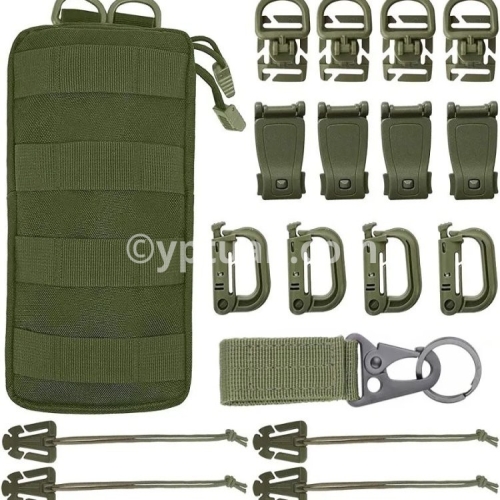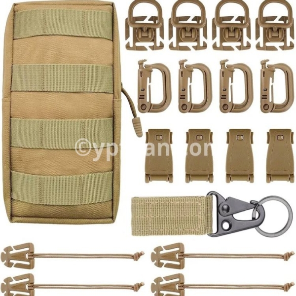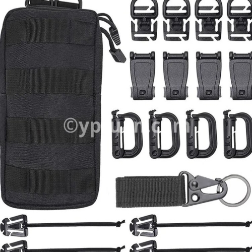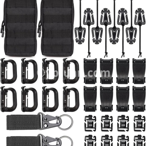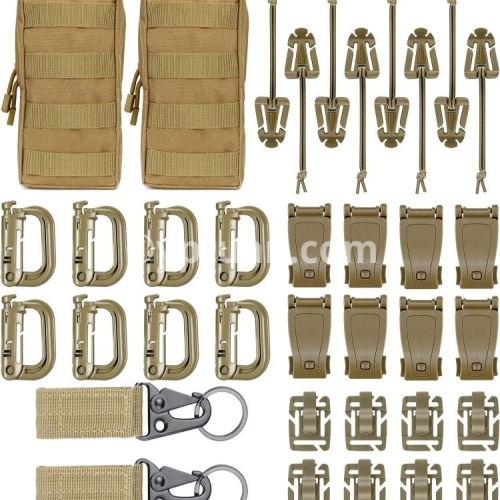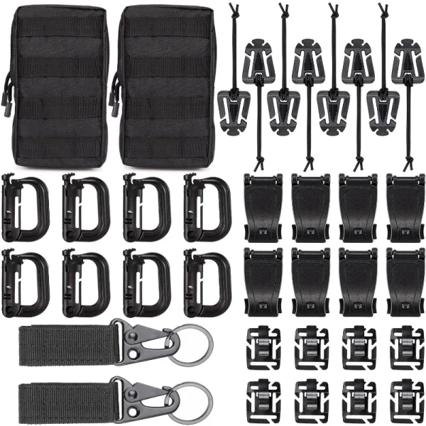 ●36Pcs Molle Accessories set: Package includes 8 x D-ring grimlock locking clip, 8 x web dominator elastic strings , 8 x strap management tool buckle, 8 x Hydration Tube Clips,2 x Key Ring and 2 x MOLLE bag ●18pcs Molle Accessories set: Package includes 4 x D-ring grimlock locking clip, 4 x web dominator elastic strings , 4 x strap management tool buckle, 4 x rotatable D ring grimlocks ,1 x Key Ring and 1 x MOLLE bag