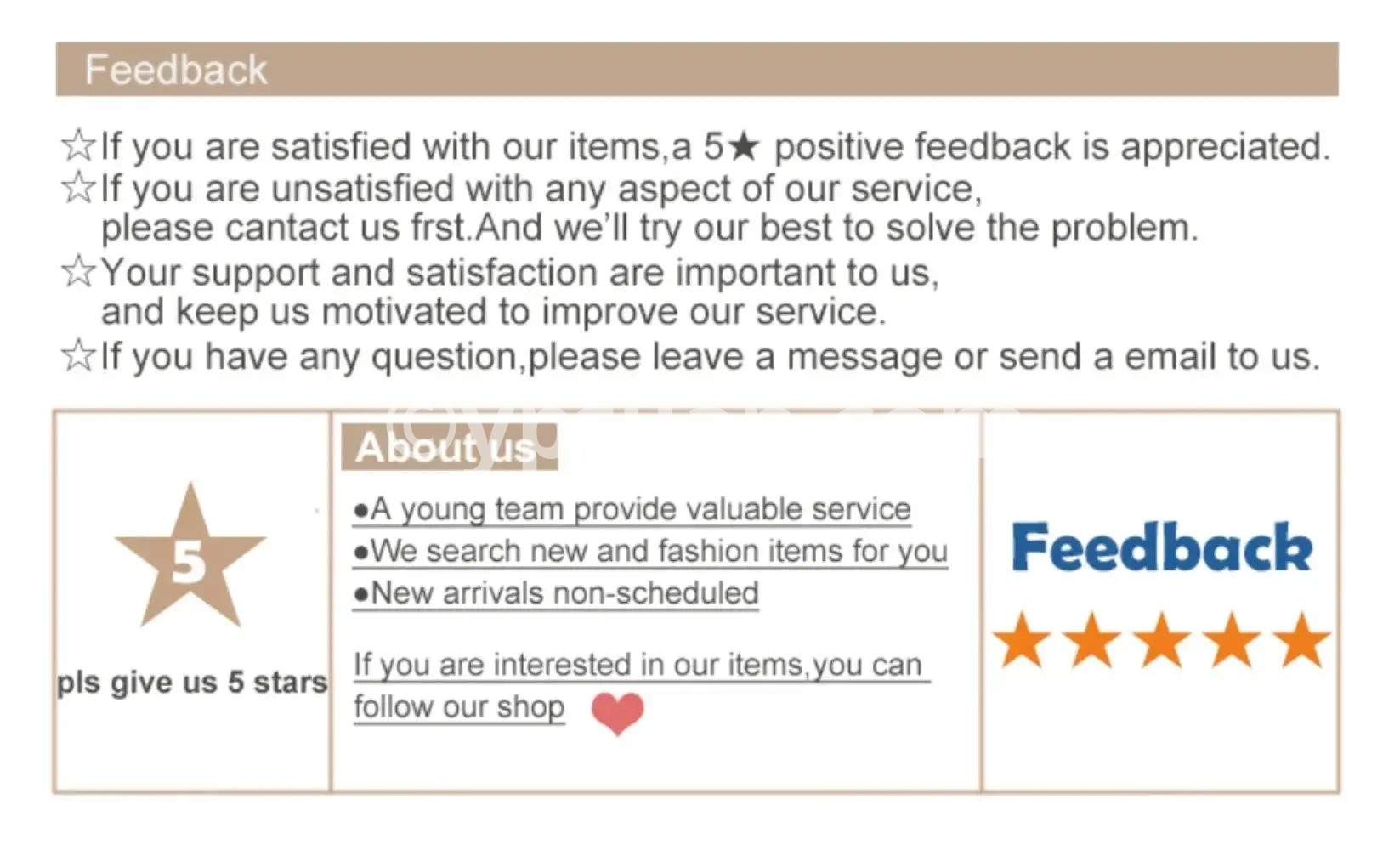 About Shipment 1 Your order is generally shipped within 24h, please kindly be more patient to wait. 2.Anything please feel free to let me know,we will solve it for you as soon as possible. About Service 1. If you have any questions, please feel free to contact us. And we will reply in 24 hours except weekends. 2. If any problems comes to you, please don't worry. You can contact us first. We promise we will try everything possible to help you. 3. Please pay attention to the time difference between us. We work in China. About Feedback 1.Your confirmation will be highly appreciated after receiving the items. Once you have received the product, hope you could leave us a positive feedback(5 stars). 2.BEFORE you leaving the negative feedback. PLEASE contact us at first, and we can help you solve the problem. 3.We strive to do better and make you feel satisfie