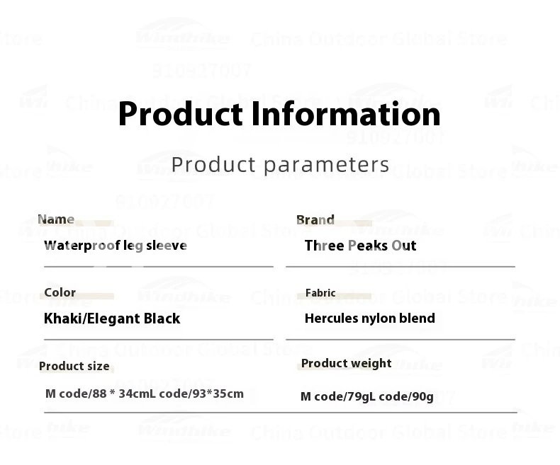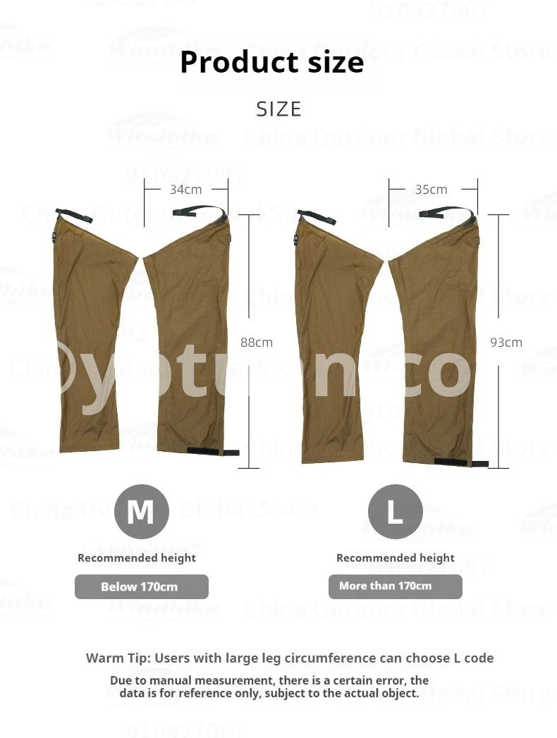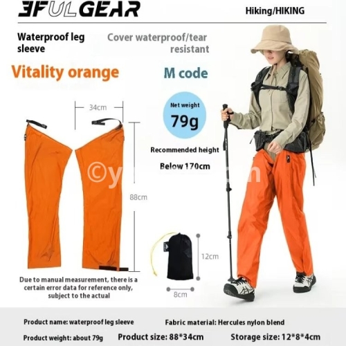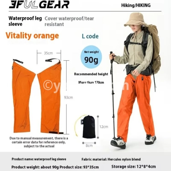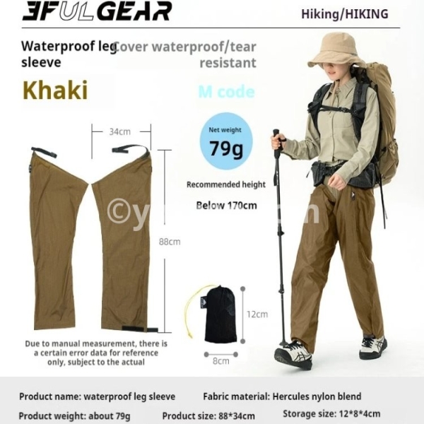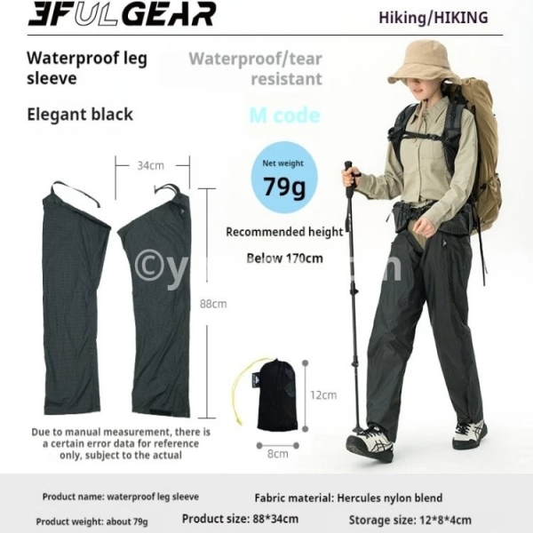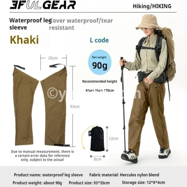 Brand: 3F UL GEAR Name: Waterproof Leg Sleeve Color: Black / Khaki Material: Dyneema Nylon Blended Size: M Size/88*34cm, L Size/93*35cm Weight: M Size/79g , L Size/90g