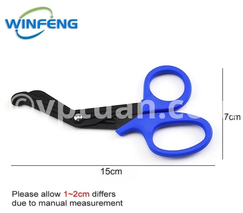 1. Size: 15cm x 7cm 2. Material: Stainless steel 3. Use for cutting tape or bandage 4. 100% brand new and high quality 5. Stainless steel blade with tough plastic handle 6. Safety shape with curved blade so not to cut patient
