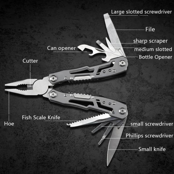 【14- IN-1 MULTI TOOLS】Our multitool pliers include 14 small tools, they include standard pliers, needle-nose pliers, wire cutters, knife, wood saw, mini slotted screwdriver, medium slotted screwdriver, large slotted screwdriver, bottle opener, can opener, metal file, phillips screwdriver, nail cleaner and key ring.