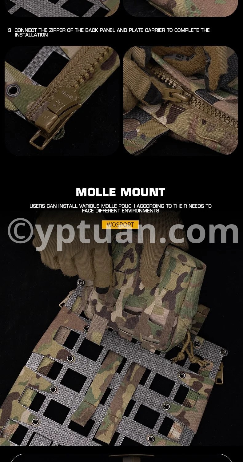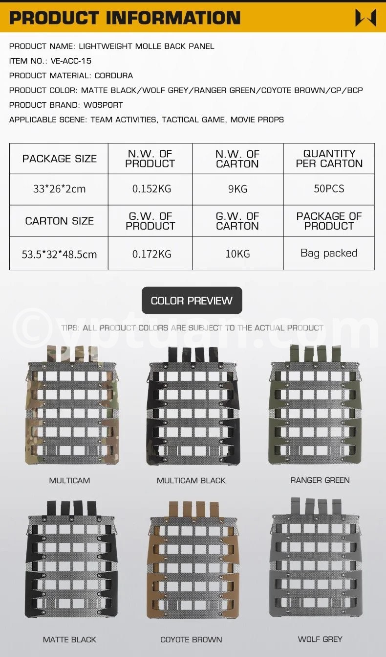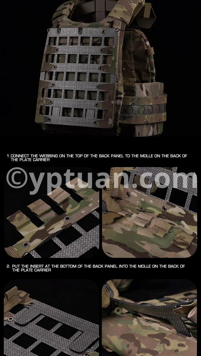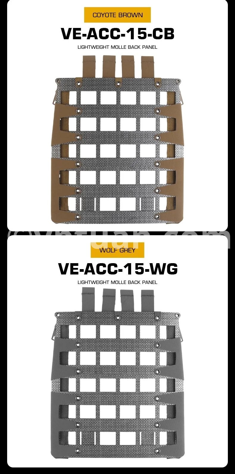Specification: Product Name:Lightweight MOLLE Back Panel Product size:33*26*2cm Product net weight:0.152KG Product gross weight:0.172KG Product colour:Matte Black/Ranger Green/Coyote Brown/MC Main material:C ordu ra fabric,Nylon Applicable scene:Hunting, outdoor sports and other Airsoft Athletics etc. Features: 1.FOR FERRO TYPE FCPC V5 PLATE CARRIER VEST: lightweight design, thinner and lighter, for ferro type fcpc v5 plate carrier vest. 2.MOLLE MOUNTING SYSTEM:allows users to install various molle packs to meet different enviroments. How to use? 1.attach the top organization strap of the back panel to the molle on the back of the vest. 2.insert the insert at the bottom of the back panel into the molle on the back of vest. 3.connect the zippers of the back panel and the vest to complete the installation. Pakage Include: 1 * molle back panel Notice: not include vest or carrier plate.