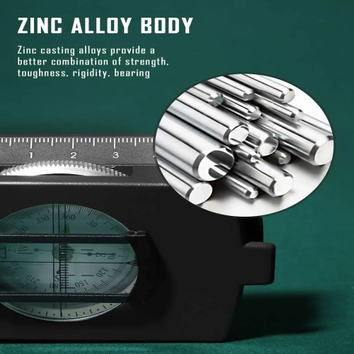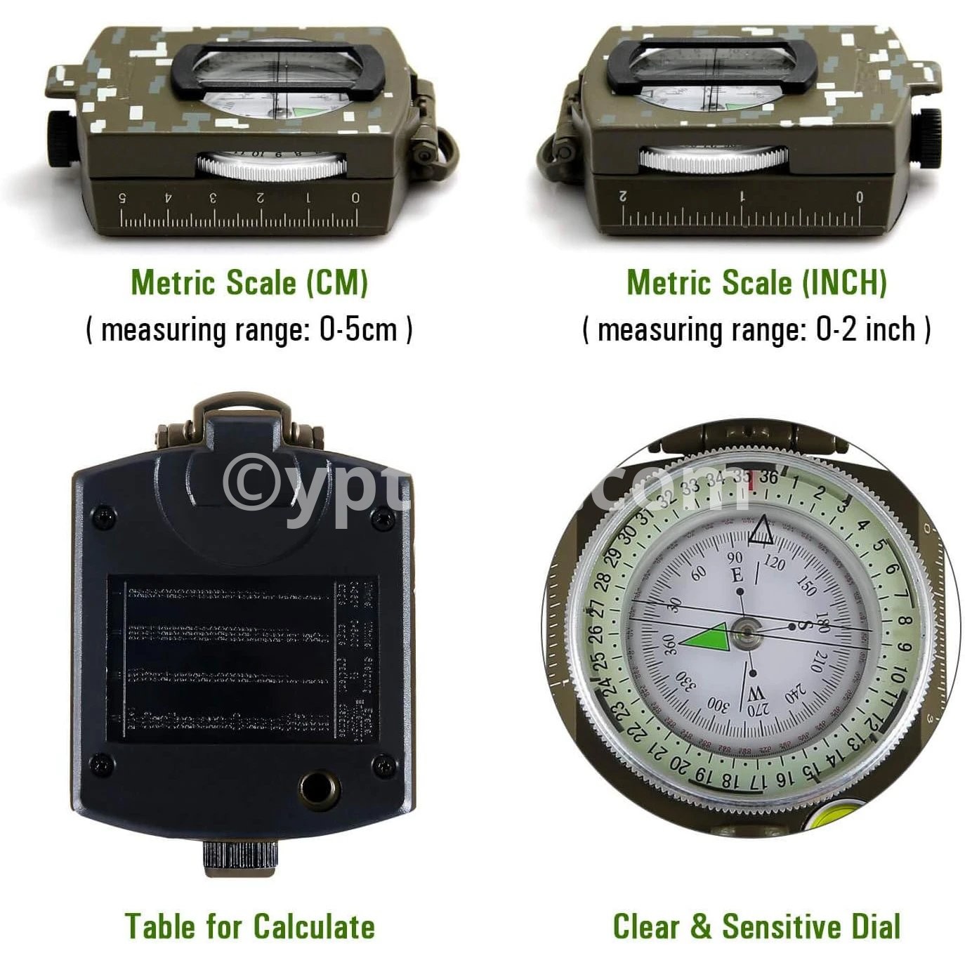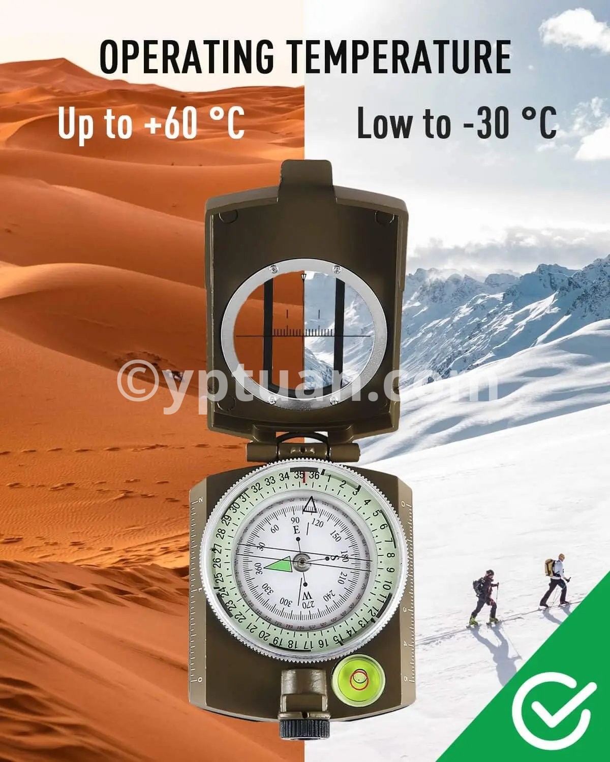 WATERPROOF AND SHOCKPROOF FOR ROUGH USE - The base and cover are constructed with metal for years of durable using. Suitable for motoring, boating, camping, mountaineering, exploring, hunting, and other outdoor activities. EASY AND ACCURATE READINGS - The floating compass dial has a 360 degrees scale with liquid-filled capsule for stable operation. Featured with a level bubble to improve accuracy, the easy to see sighting window with reticle makes it easy to aim and read. TAKING BEARINGS EASILY - Build with an optical eyepiece for sighting bearings easily, with azimuth 360-degree and reversed 360-degree scale, you can take bearings from you to the objects or take reverse bearings from the object to you all quick and easy. ALLOW FOR CLEAR READING AT NIGHT - When exposed to enough light, the north arrow and display light up in the dark with fluorescent light, allowing you to see the reading if it is pitch black. MORE FEATURES - A conversion chart for angle, gradient, and distance appear on the back of the compass, and a rotating bezel ring allows you to lock in your bearing so you know you are heading in the right direction.