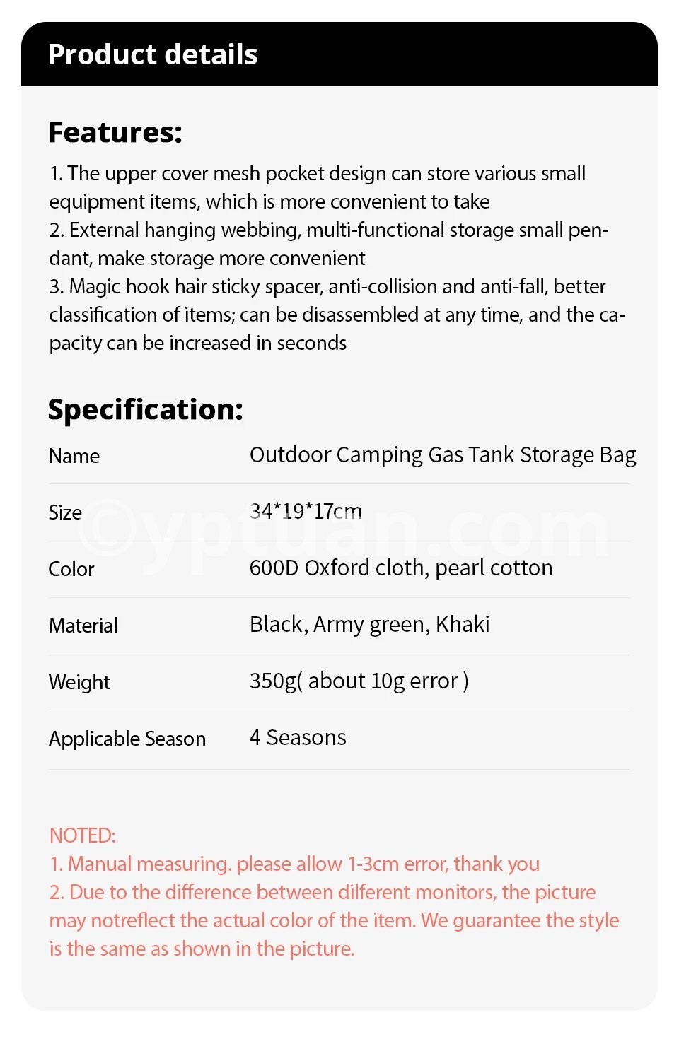 The gas tank storage bag has a large capacity, allowing you to store multiple gas canisters and other outdoor tools in one place.