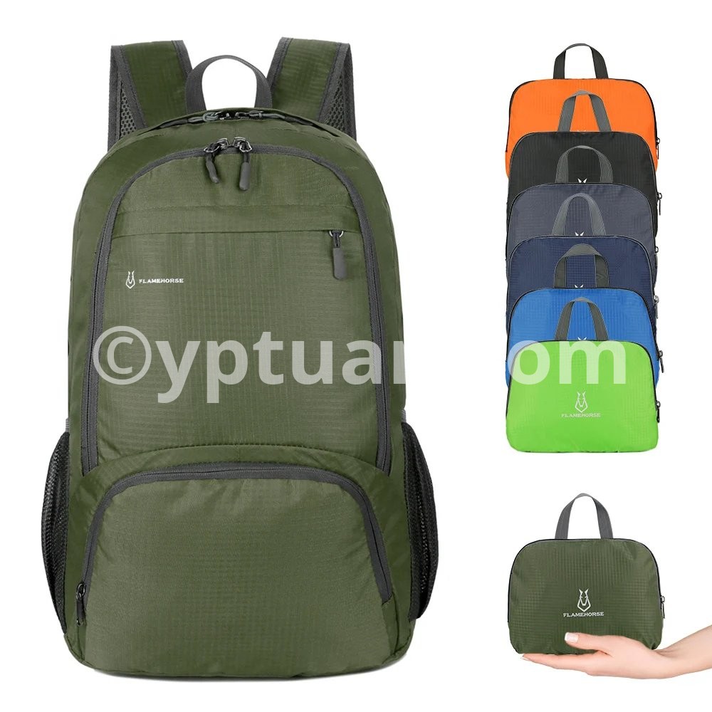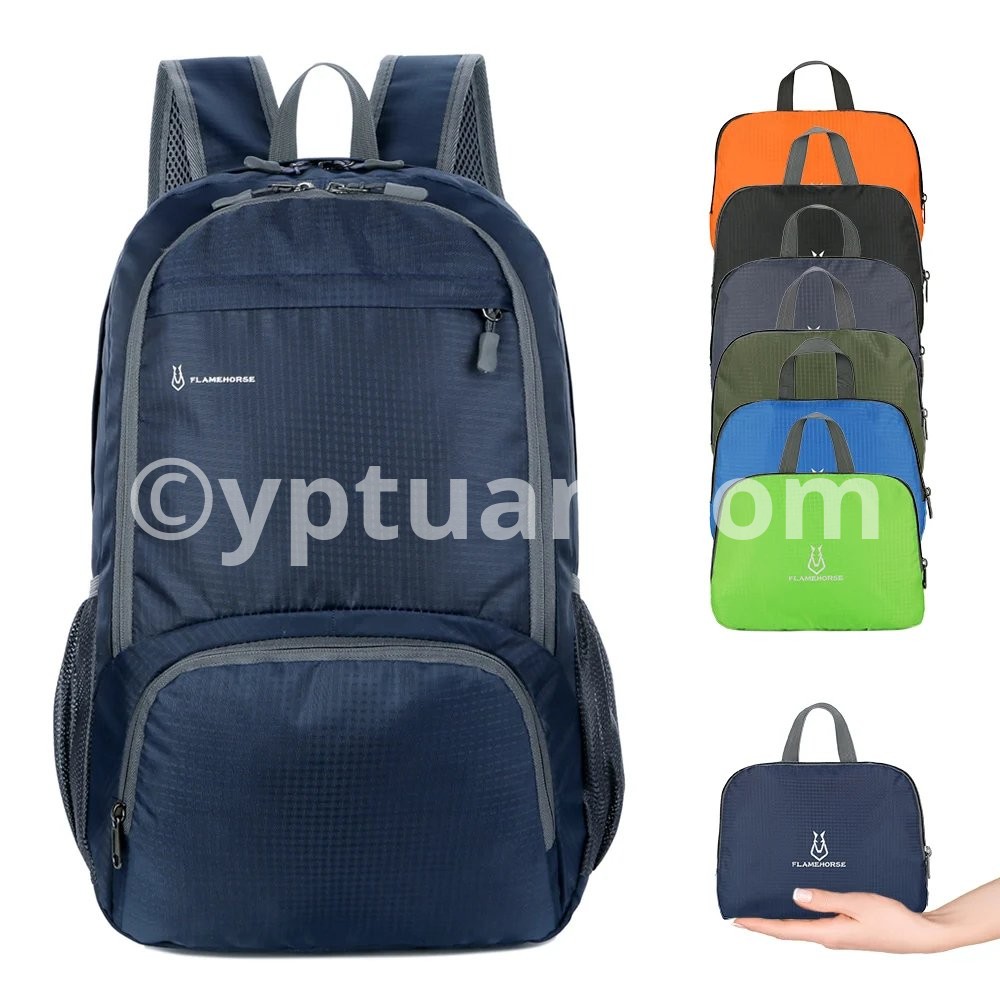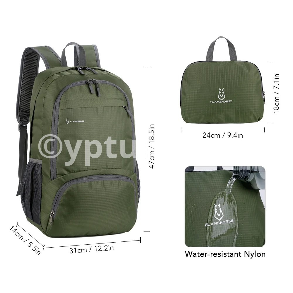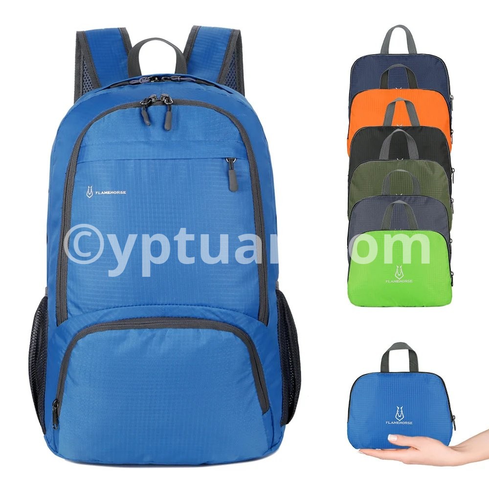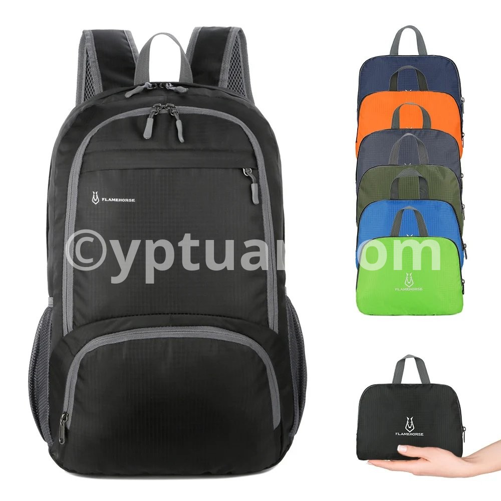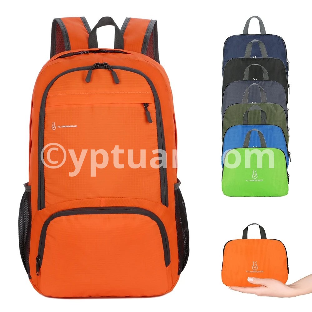 Made with premium nylon fabric, the backpack is lightweight and water-resistant. It features a main compartment, 3 zippered front pockets and 2 mesh side pockets to keep your items organized. It is foldable into a compact size for convenient storage, great for camping, hiking, cycling, traveling, and other outdoor activities.