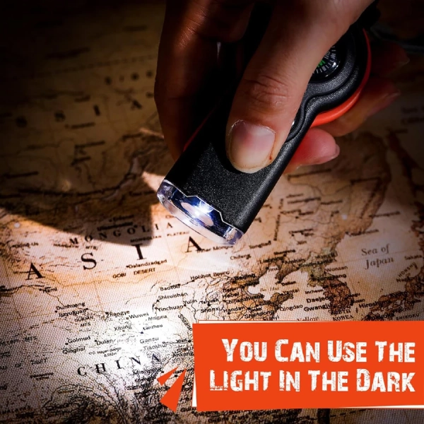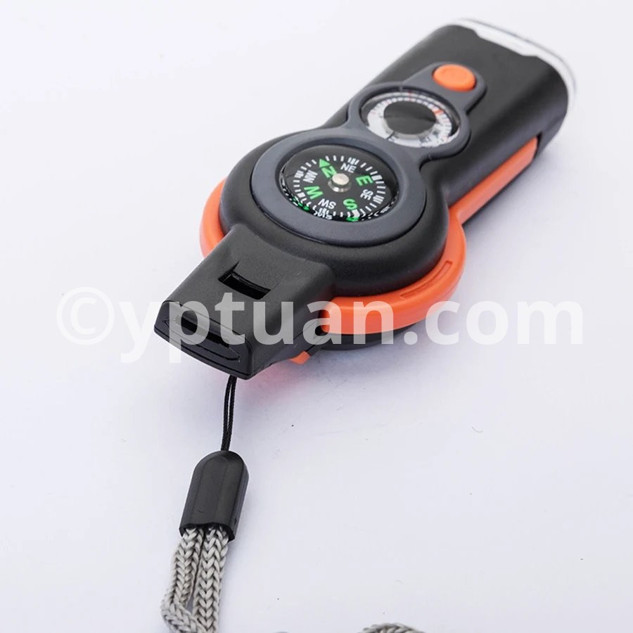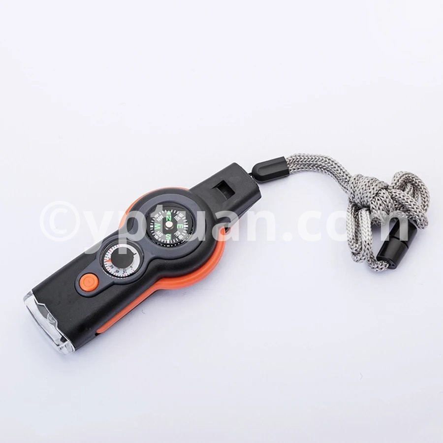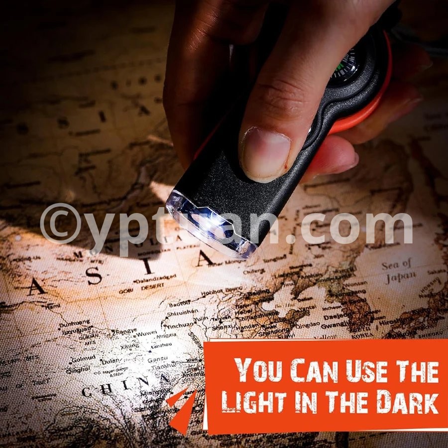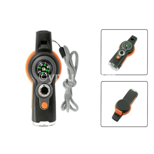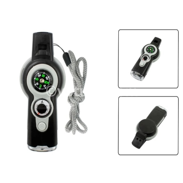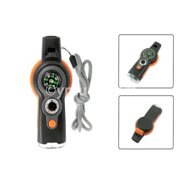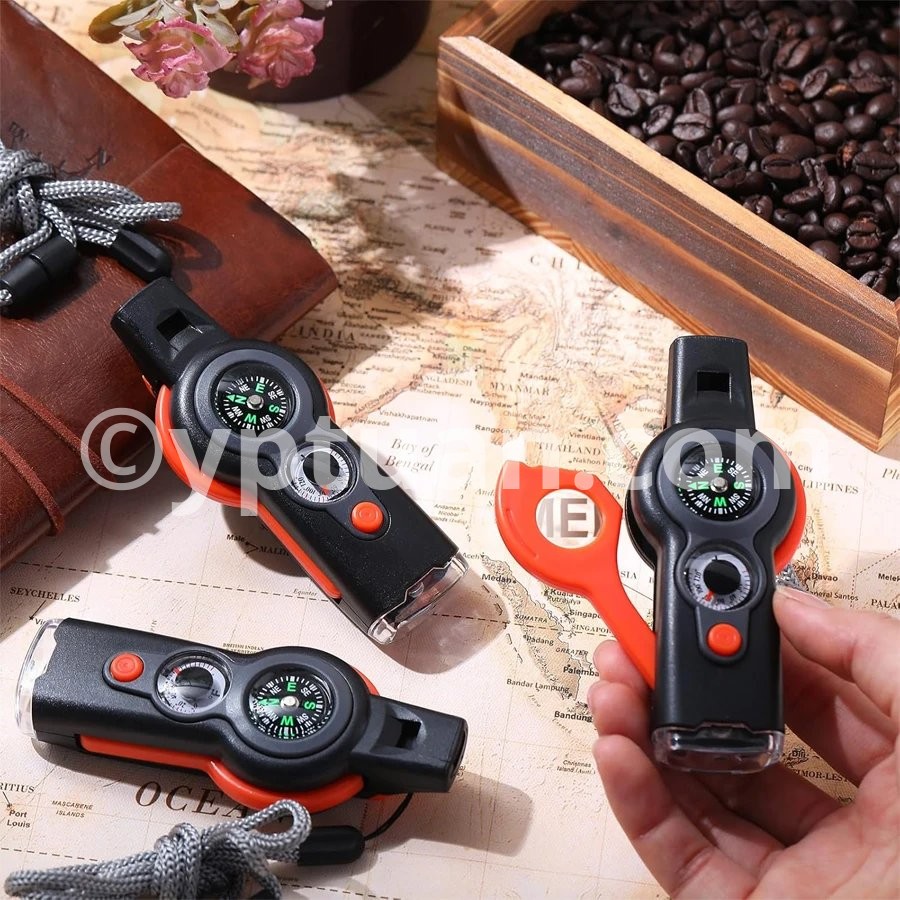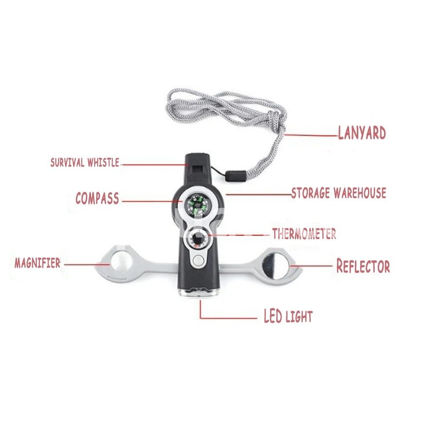 this camping whistle is thoughtfully designed with 7 integrated features, a whistle, a compass, a thermometer, a magnifying glass, a reflector, a storage bin and LED light